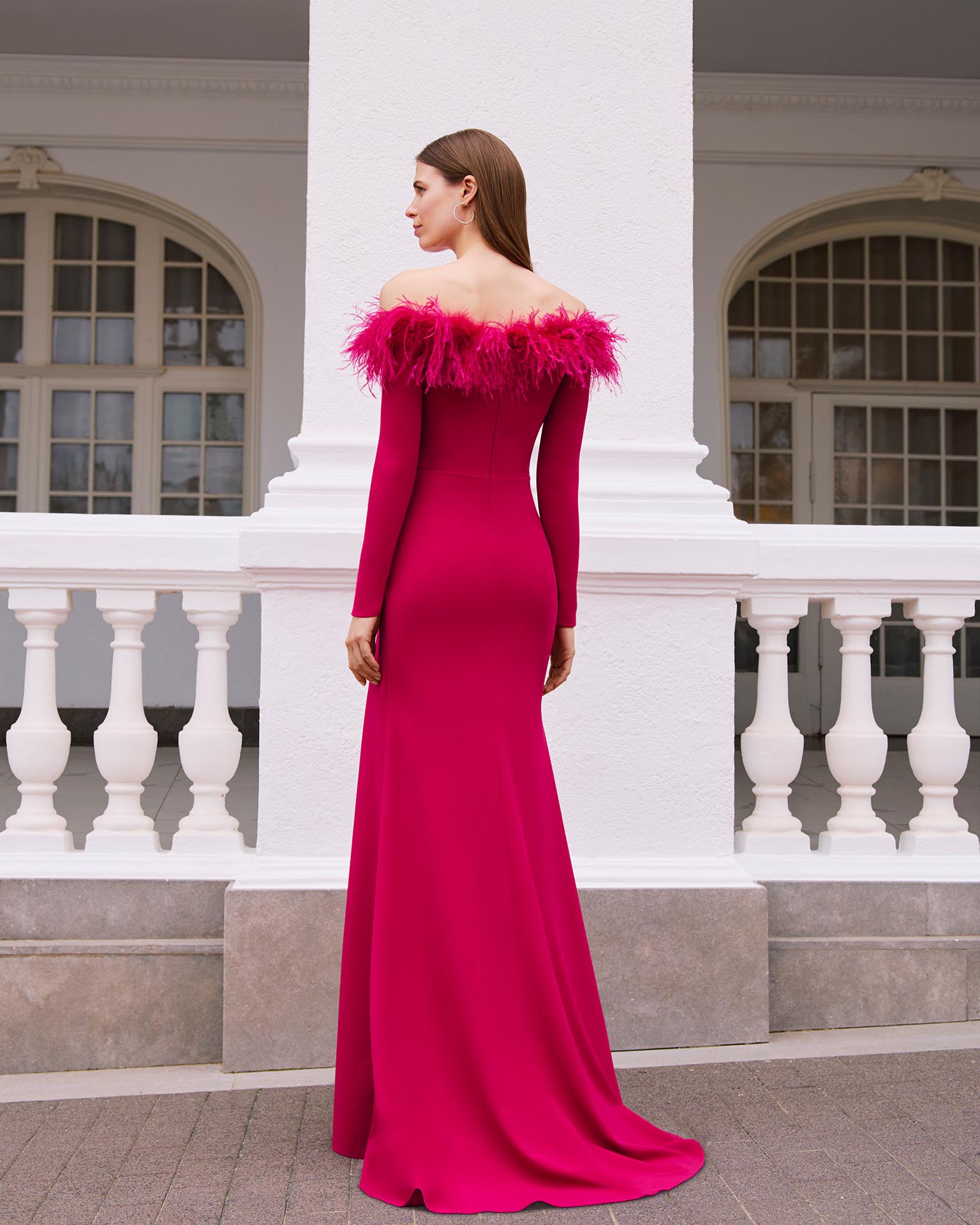 Long evening dress made of elastic crepe with feathers. Featuring a boat neckline, long sleeves, and a closed back. Comes with a shawl.