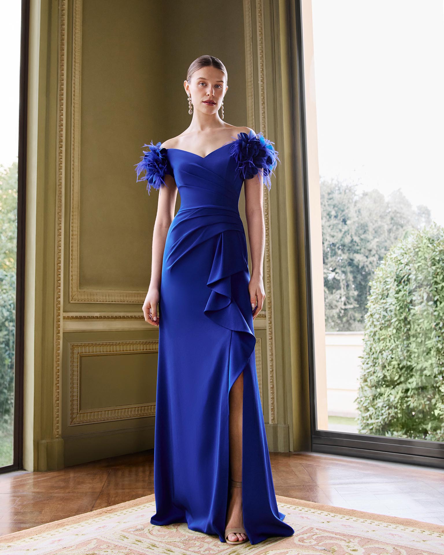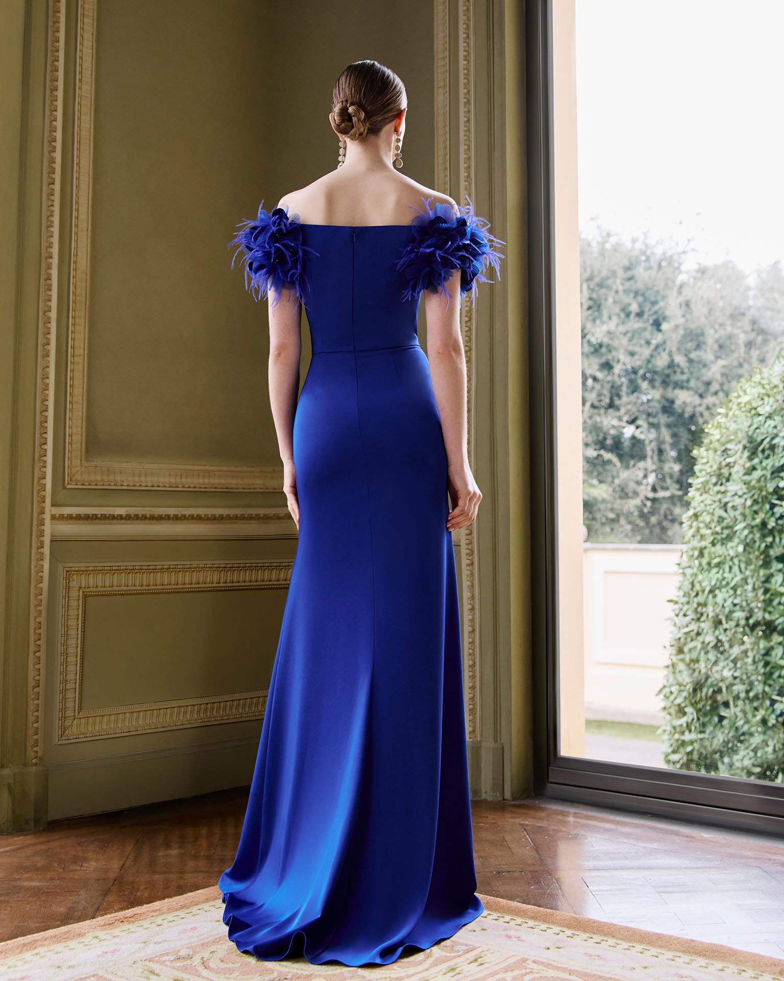 Long evening dress made of satin crepe and feathers. Off-the-shoulder neckline and shawl included.