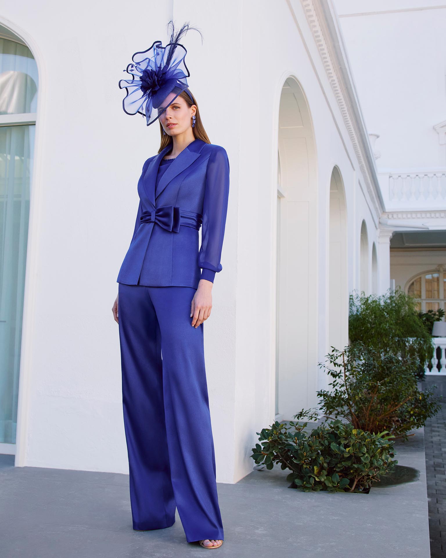 Evening blouse and trousers, three-piece made of satin. Featuring a round neckline, straps, and a closed back. Comes with a jacket.