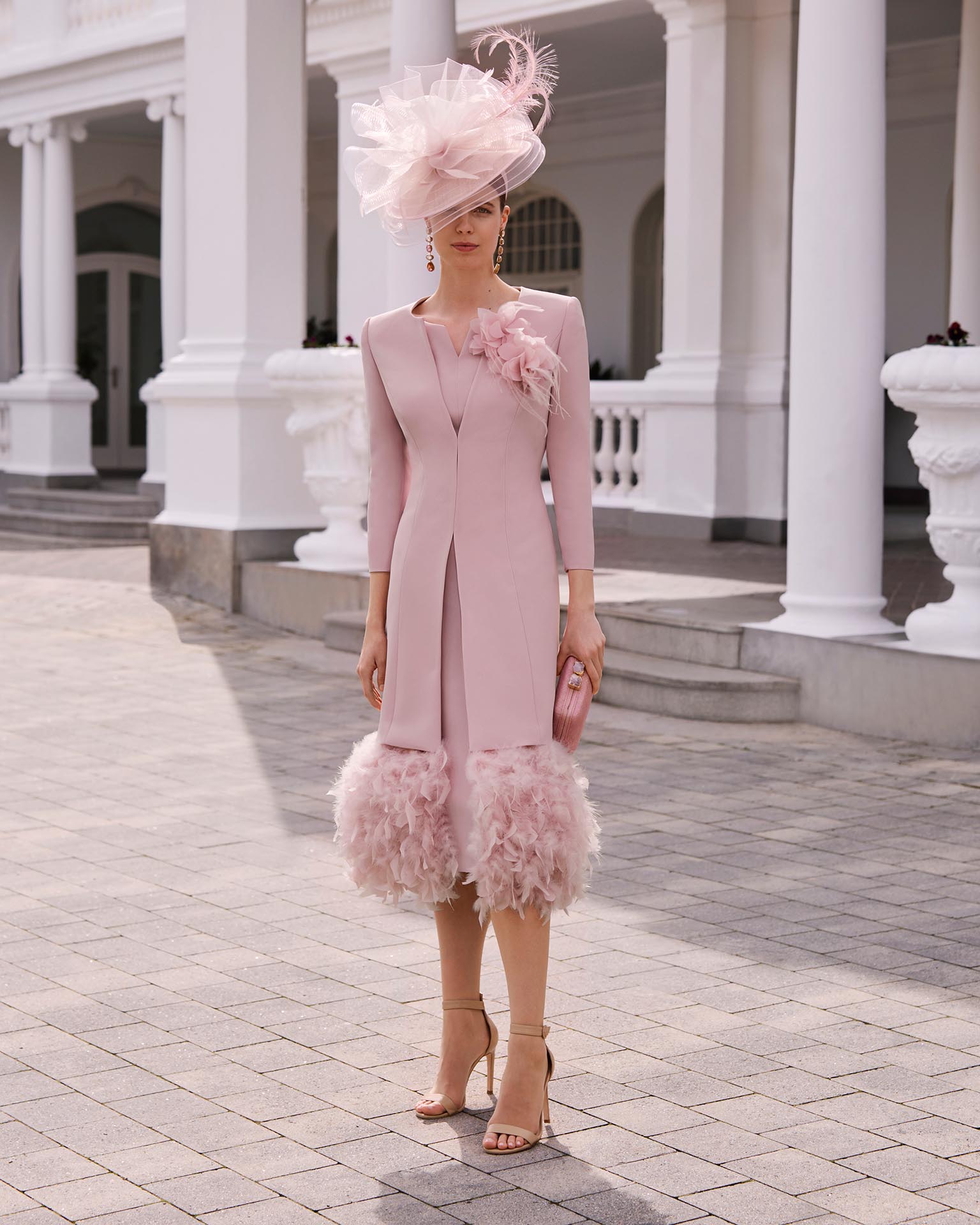 Midi evening dress, two-piece made of triacetate. Featuring a boat neckline, short sleeves, and a closed back with a coat.