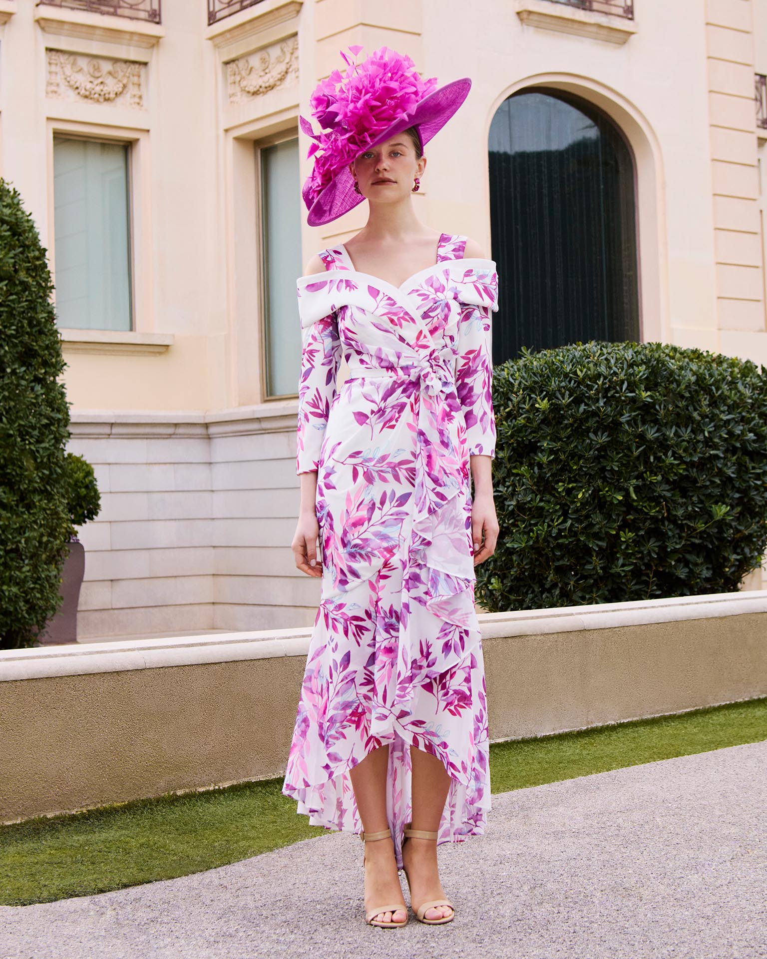 High-low evening dress, made of printed chiffon. Featuring an off-the-shoulder neckline, three-quarter sleeves, and a back zipper.