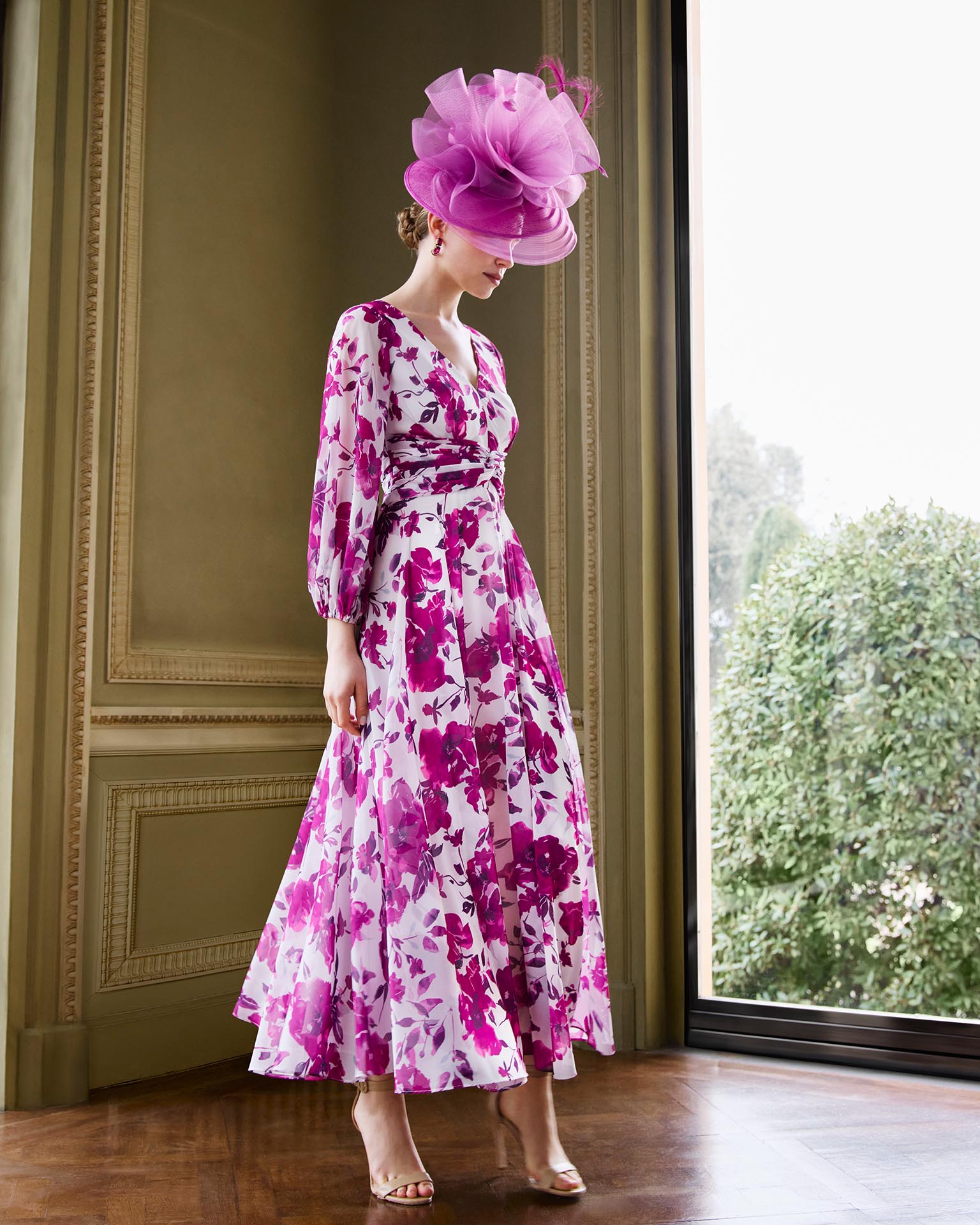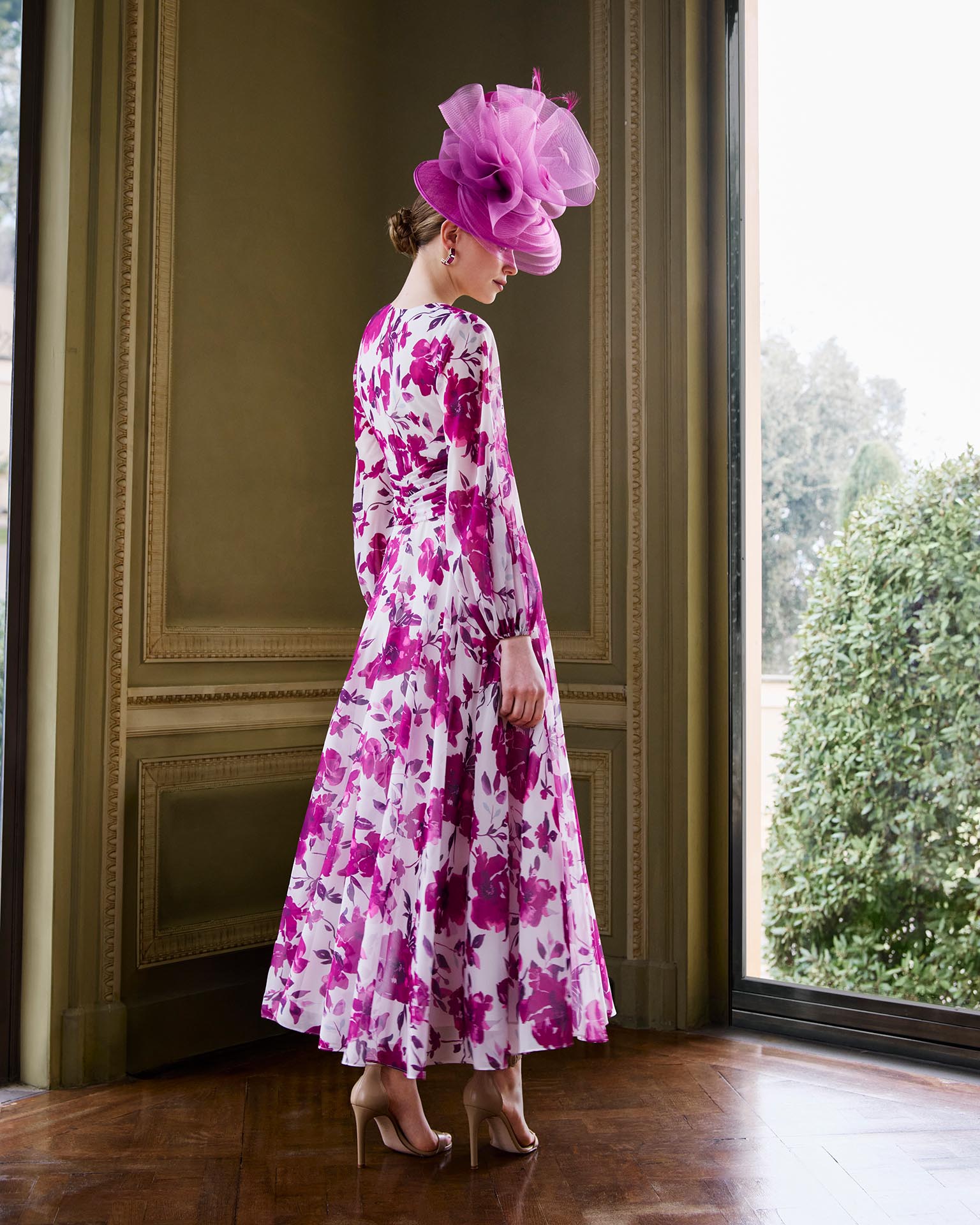 Midi evening dress, made of printed chiffon. Featuring a V-neckline, puffed sleeves, and a closed back.