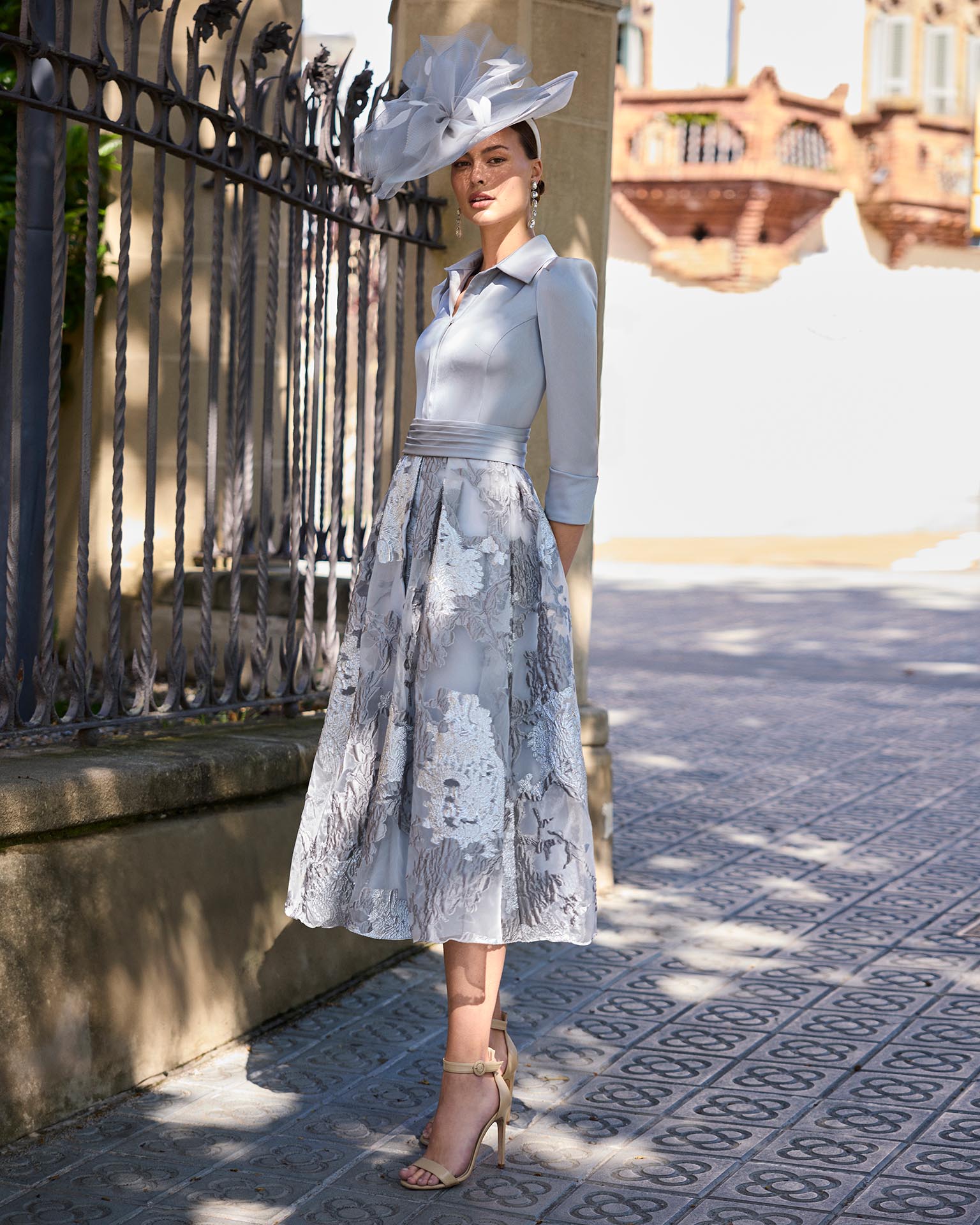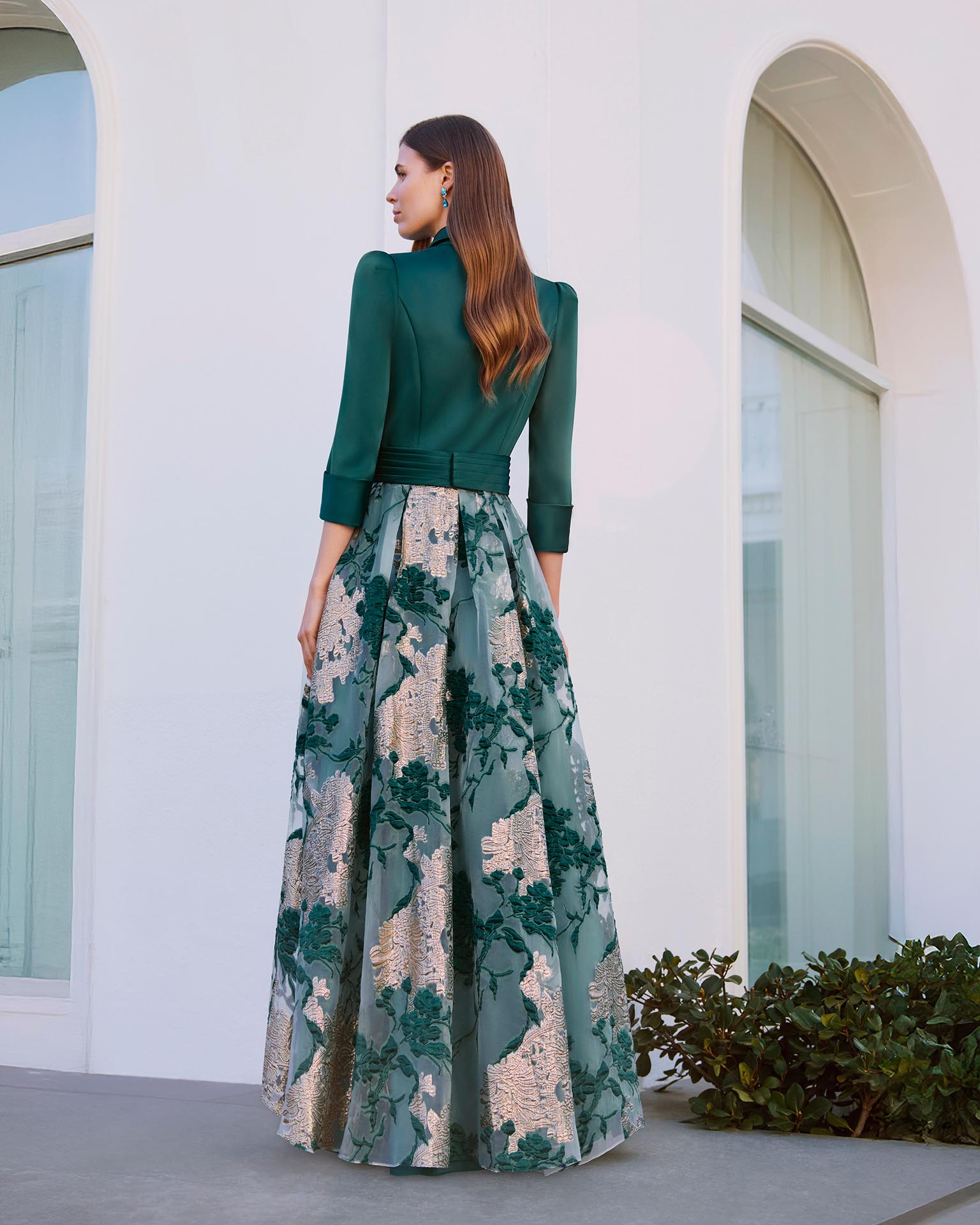 Long evening dress, made of fil coupé. Featuring a satin bodice, a shirt collar, long sleeves, and a closed back.