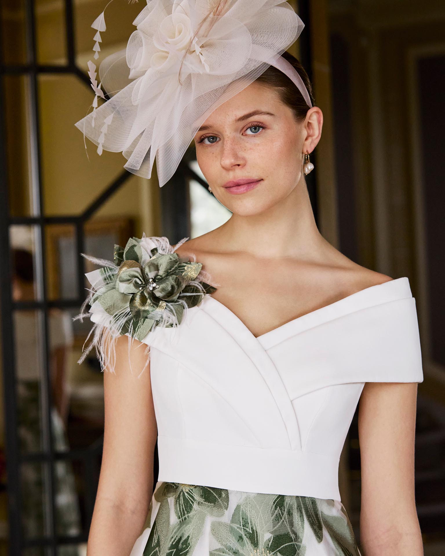 Midi evening dress, made of fil coupé with a crepe bodice. Featuring a wrap neckline, a straight back, and a shawl.