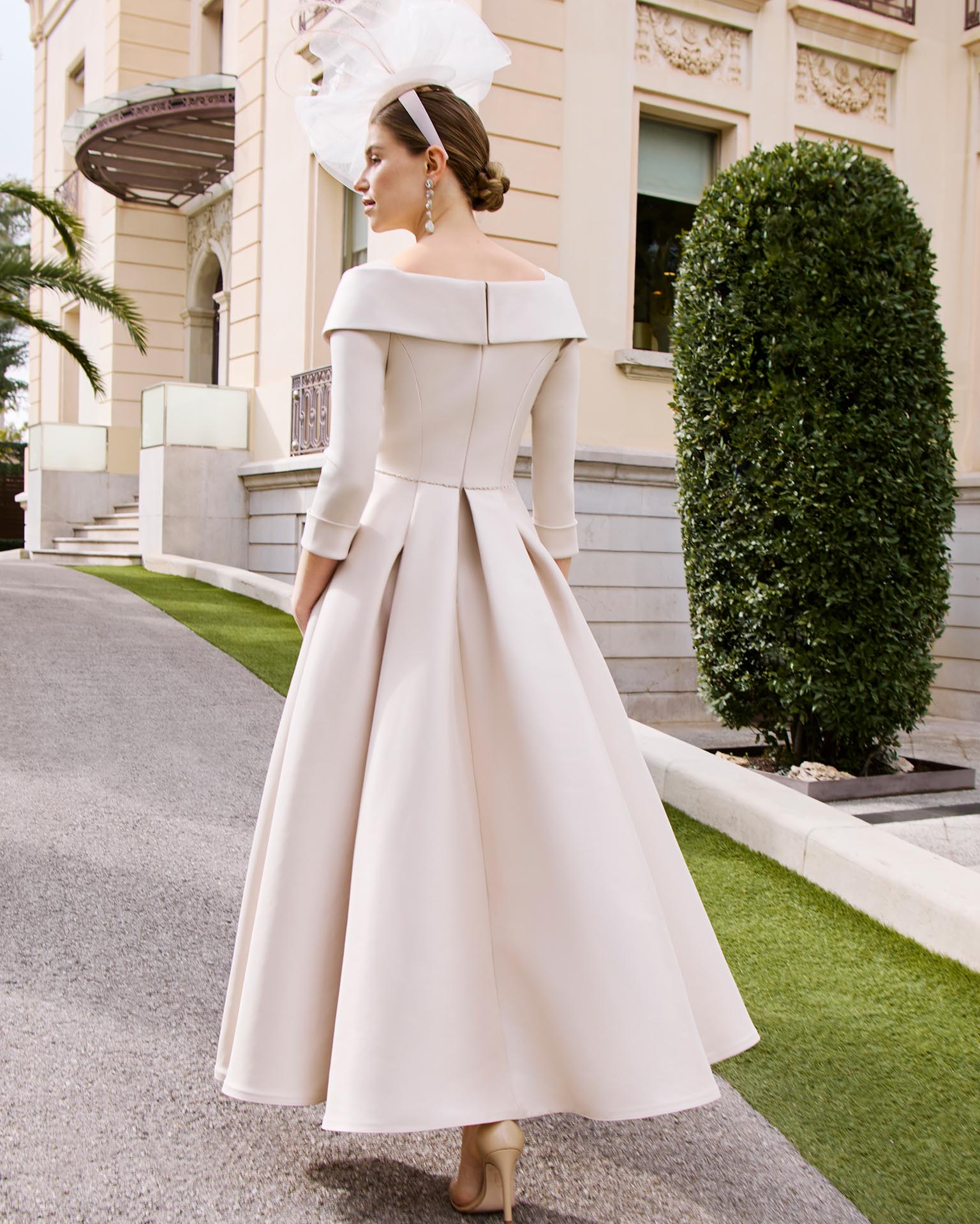 Midi evening dress made of stretch mikado. Featuring a sweetheart neckline, three-quarter sleeves, and closed back.