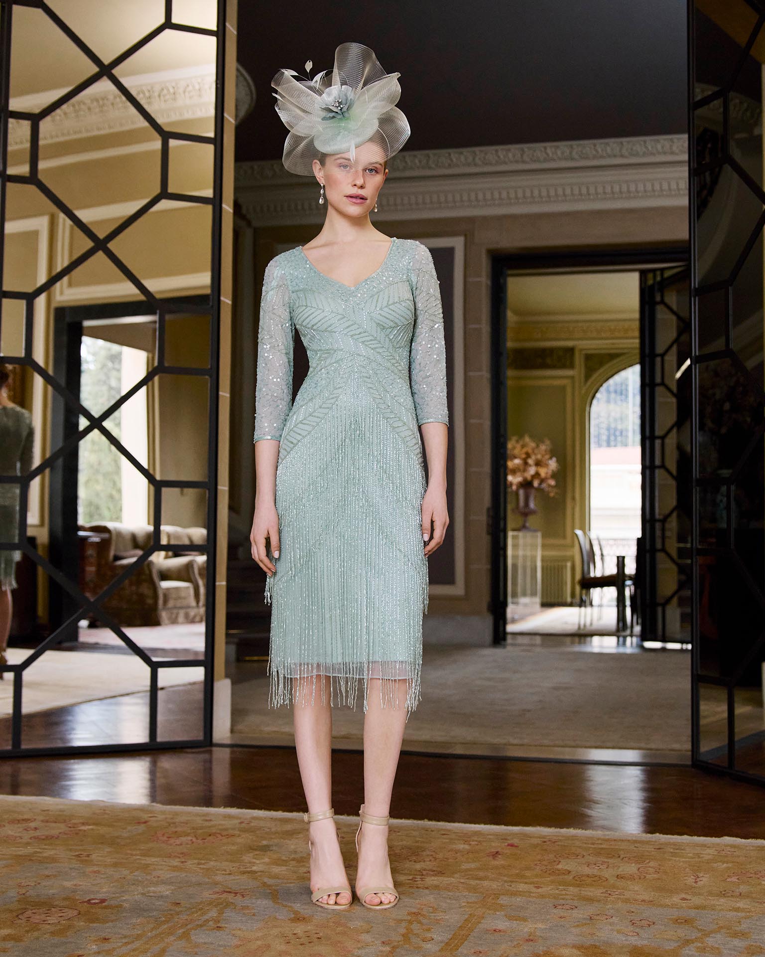 Short evening dress, made of beading. Featuring a V-neckline, three-quarter sleeves, and a closed back.
