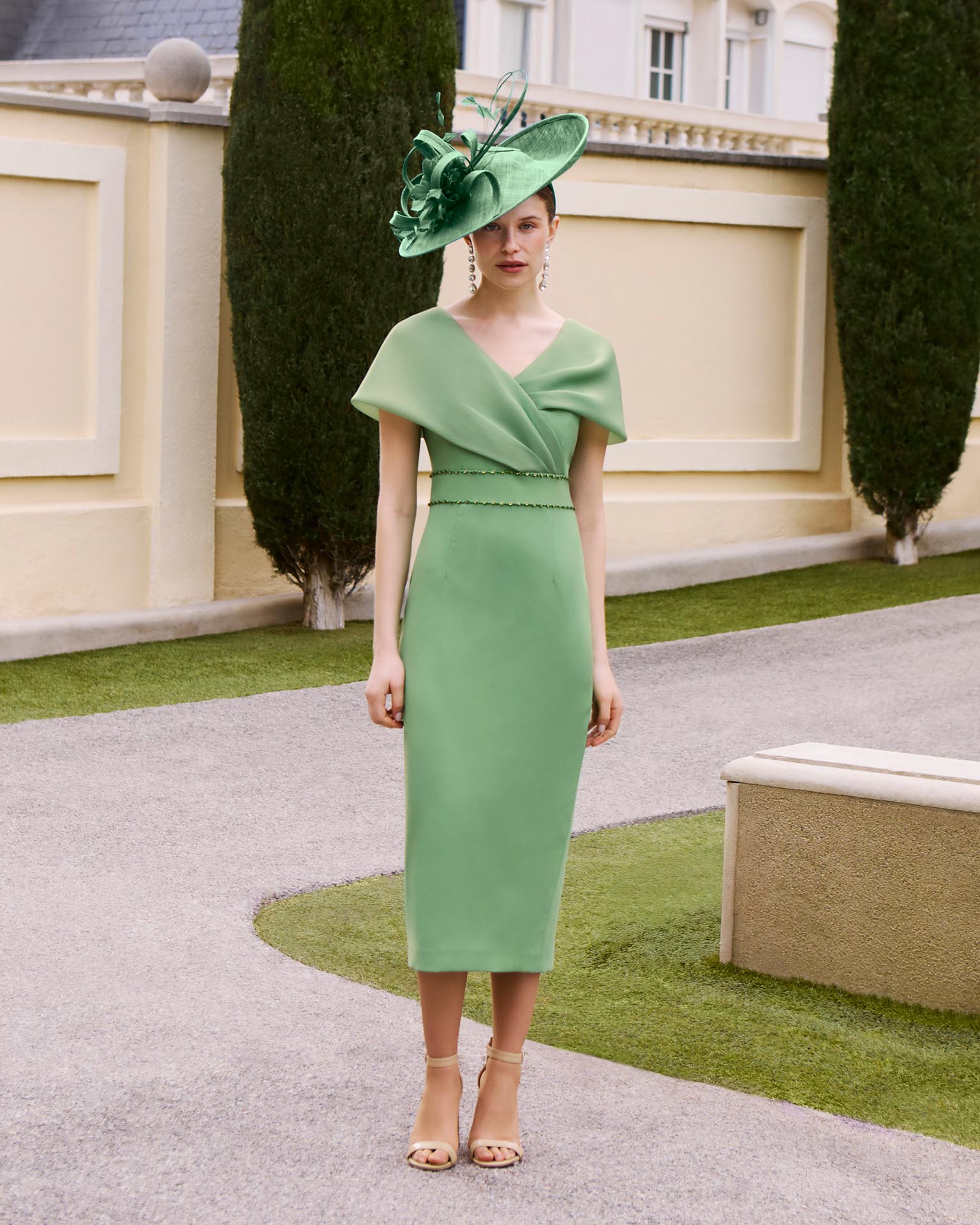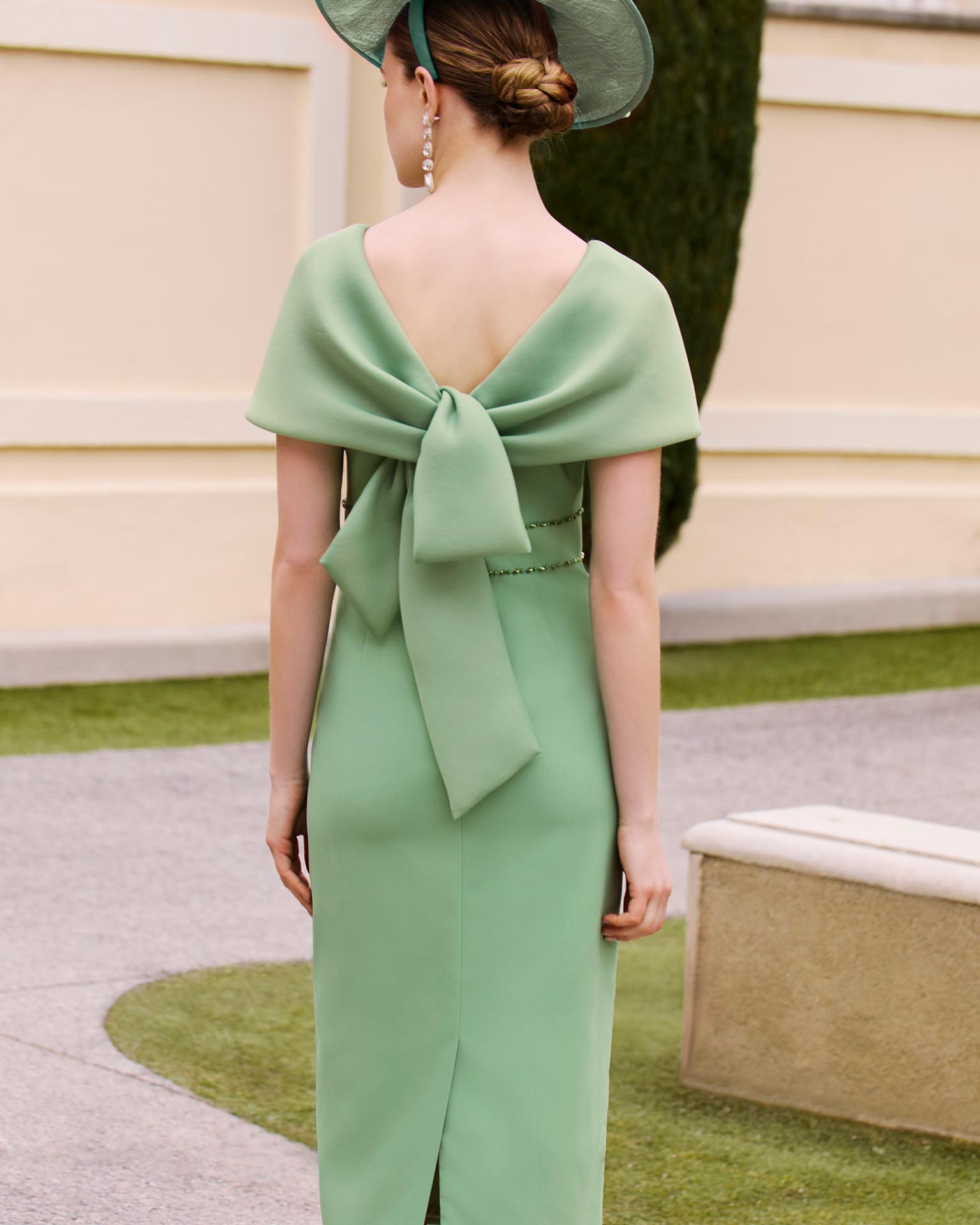 Midi evening dress, made of crepe. Featuring a wrap neckline, cape sleeves, a back with a bow detail, and a shawl.