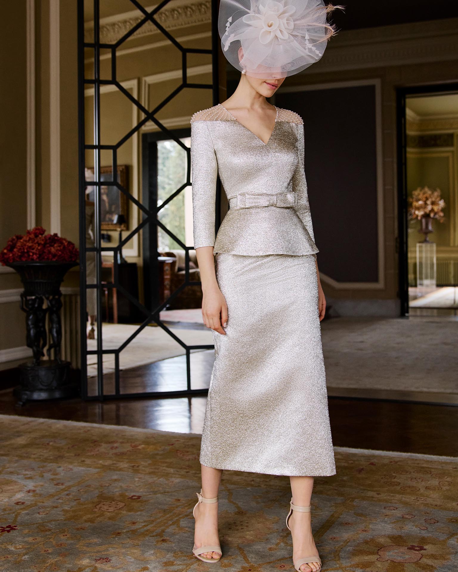 Midi evening dress, made of brocade with beading. Featuring a V-neckline, three-quarter sleeves, and a closed back.