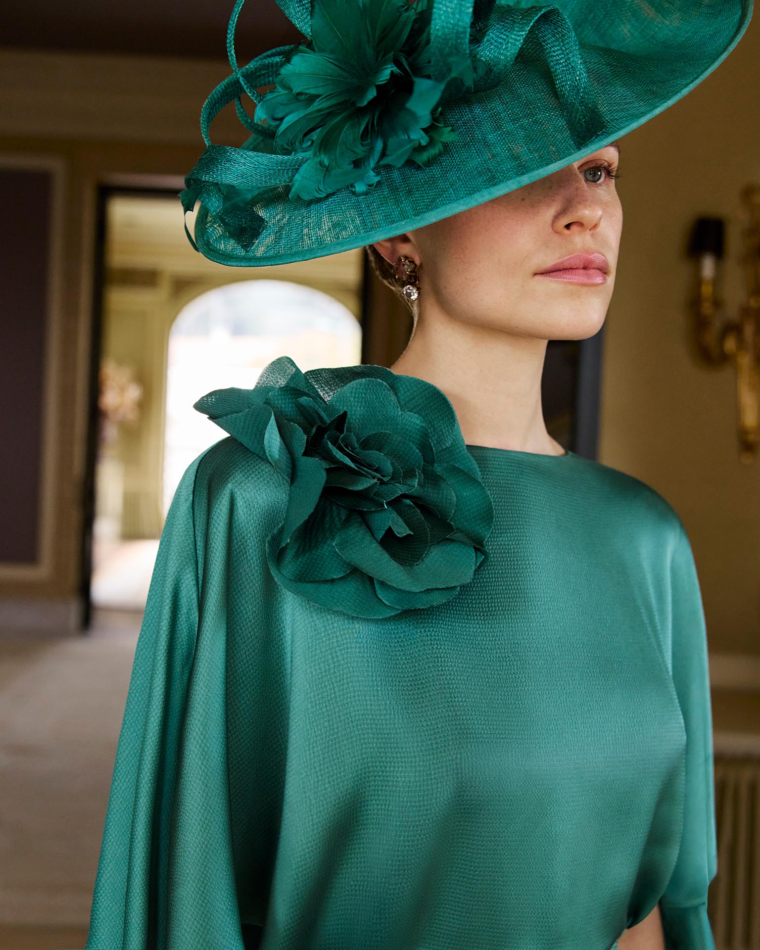 Midi evening dress, made of textured satin. Featuring a boat neckline, cape sleeves, a closed back, and a floral detail.