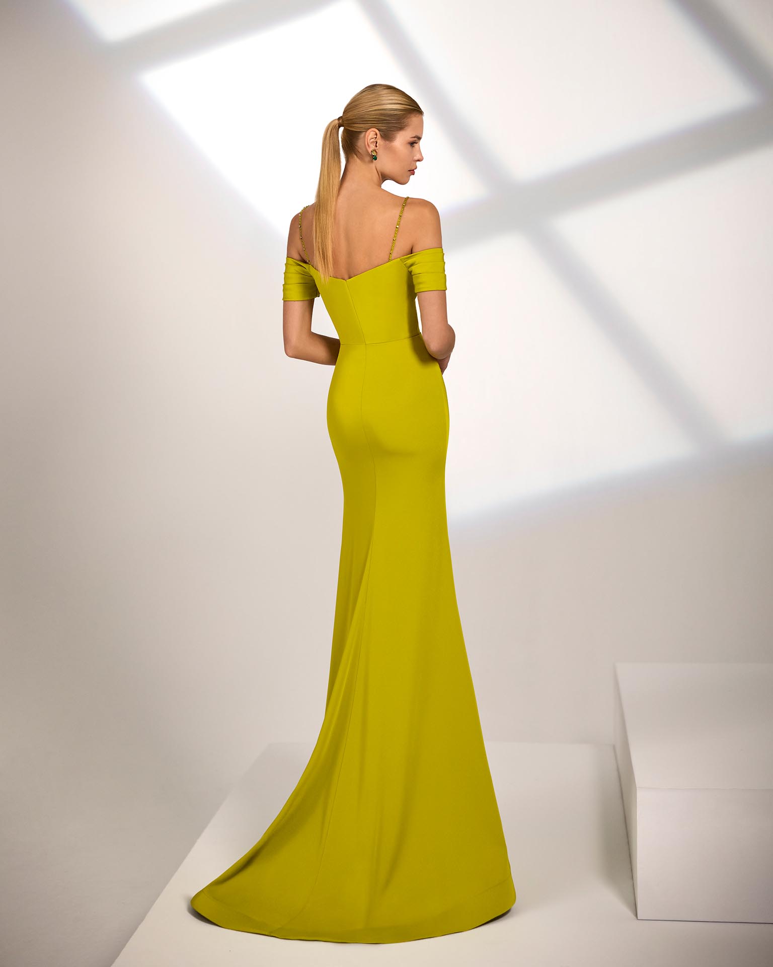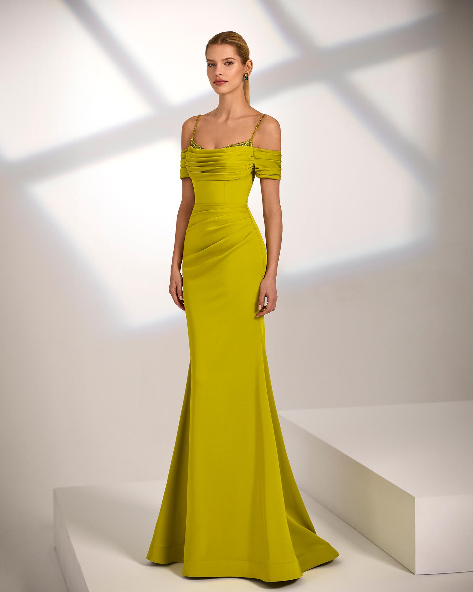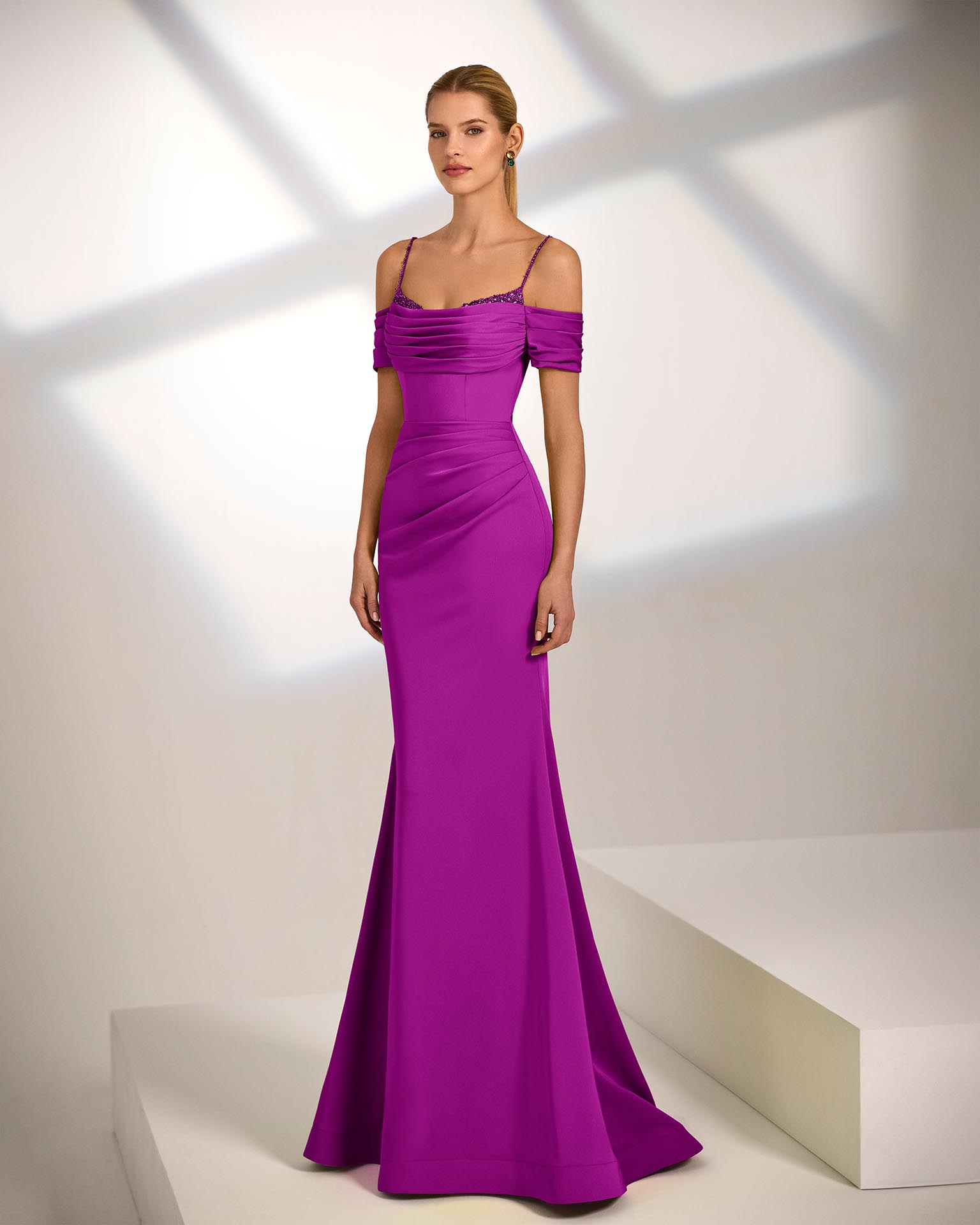 Long evening dress. Made of satin crepe. Beaded straps and draped sleeve. Includes shawl.