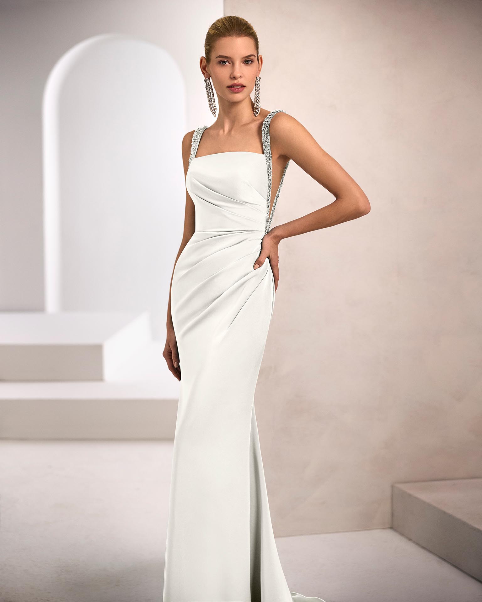 Long evening dress. Made of satin crepe. Beaded straps. Includes shawl.