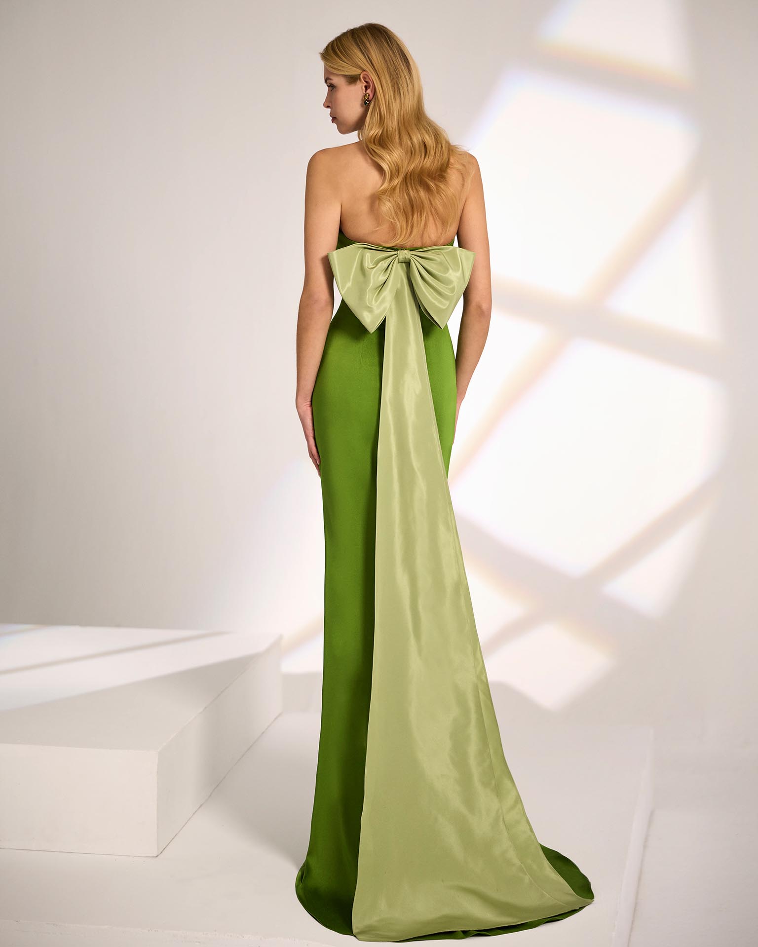 Long evening dress. Made of satin crepe and taffeta. Strapless neckline and detachable bow. Includes shawl.