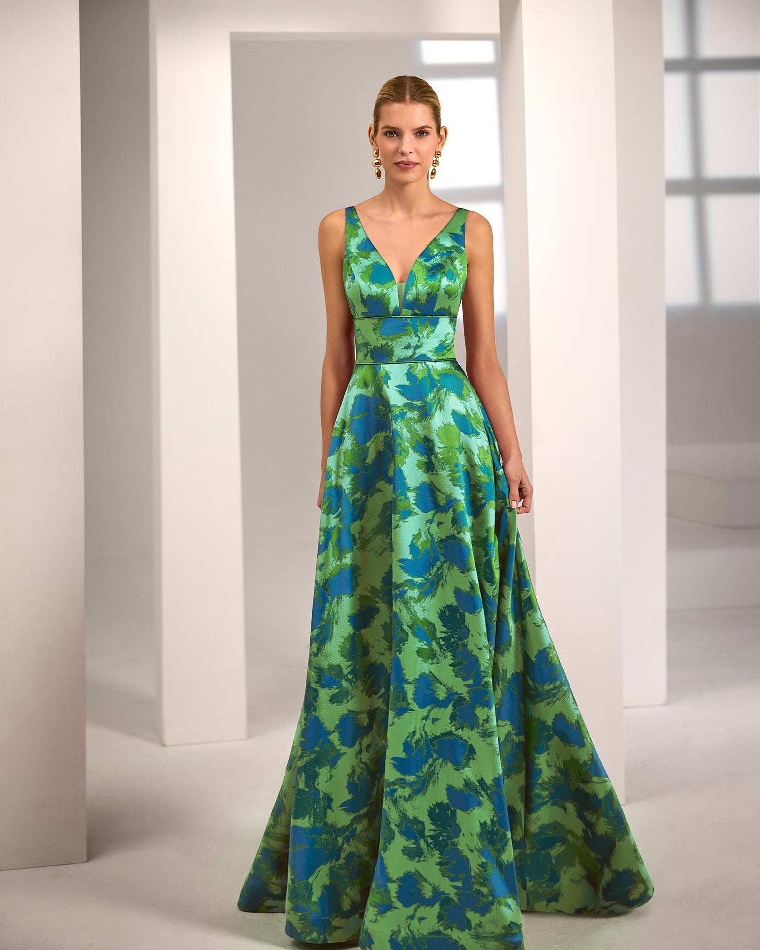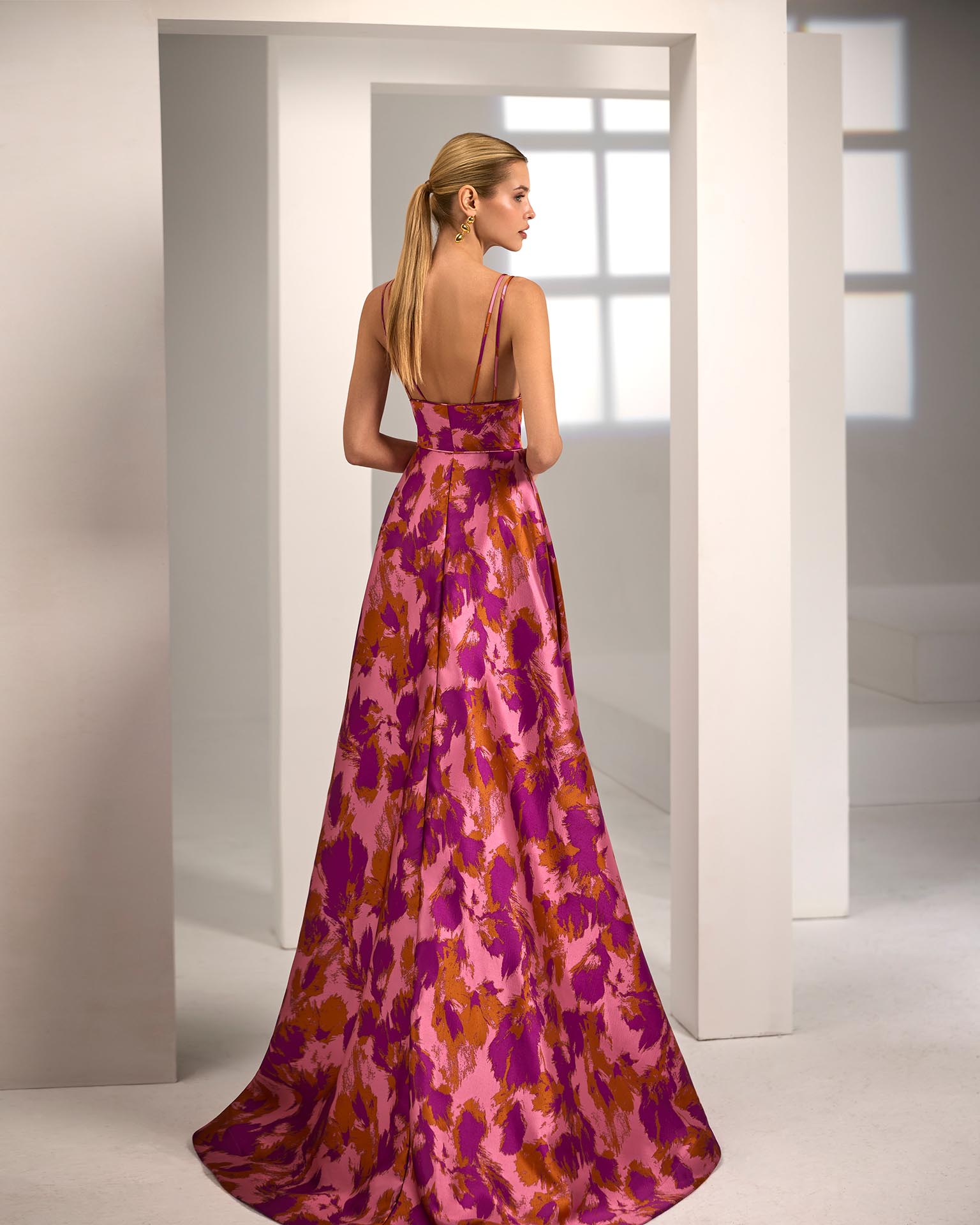 Long evening dress. Made of brocade. V-neckline and double straps. Open back. Includes shawl.