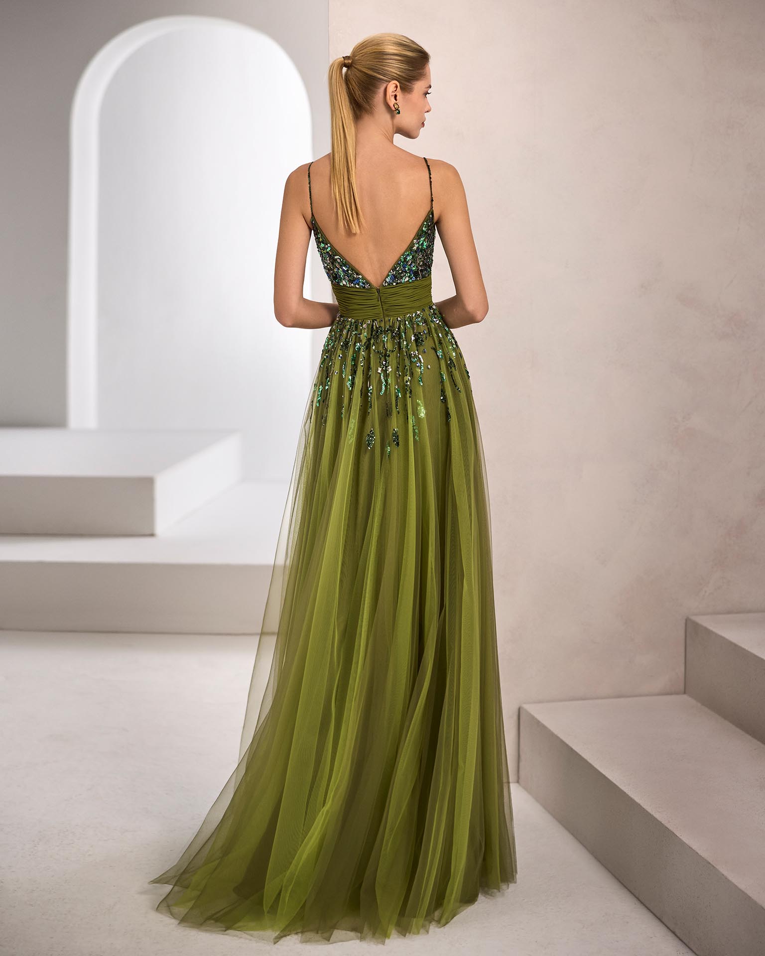 Long evening dress. Made of tulle. V-neckline and V-back. Beaded bodice. Includes shawl.