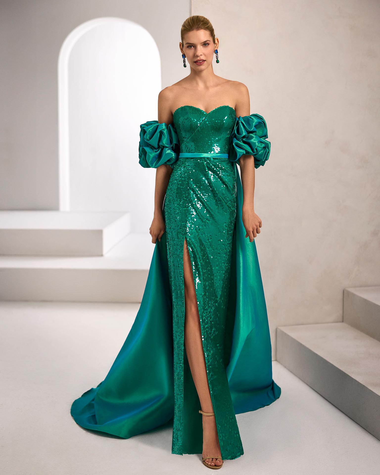 Long evening dress. Made of sequins. Sweetheart neckline and belt. Taffeta Watteau train. Includes shawl.