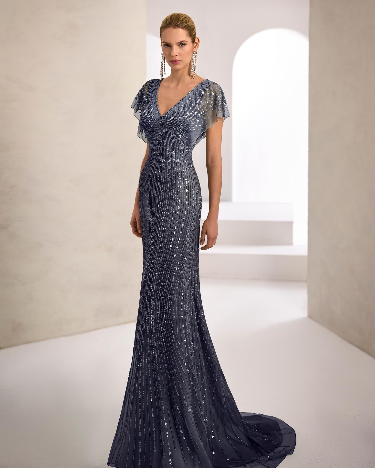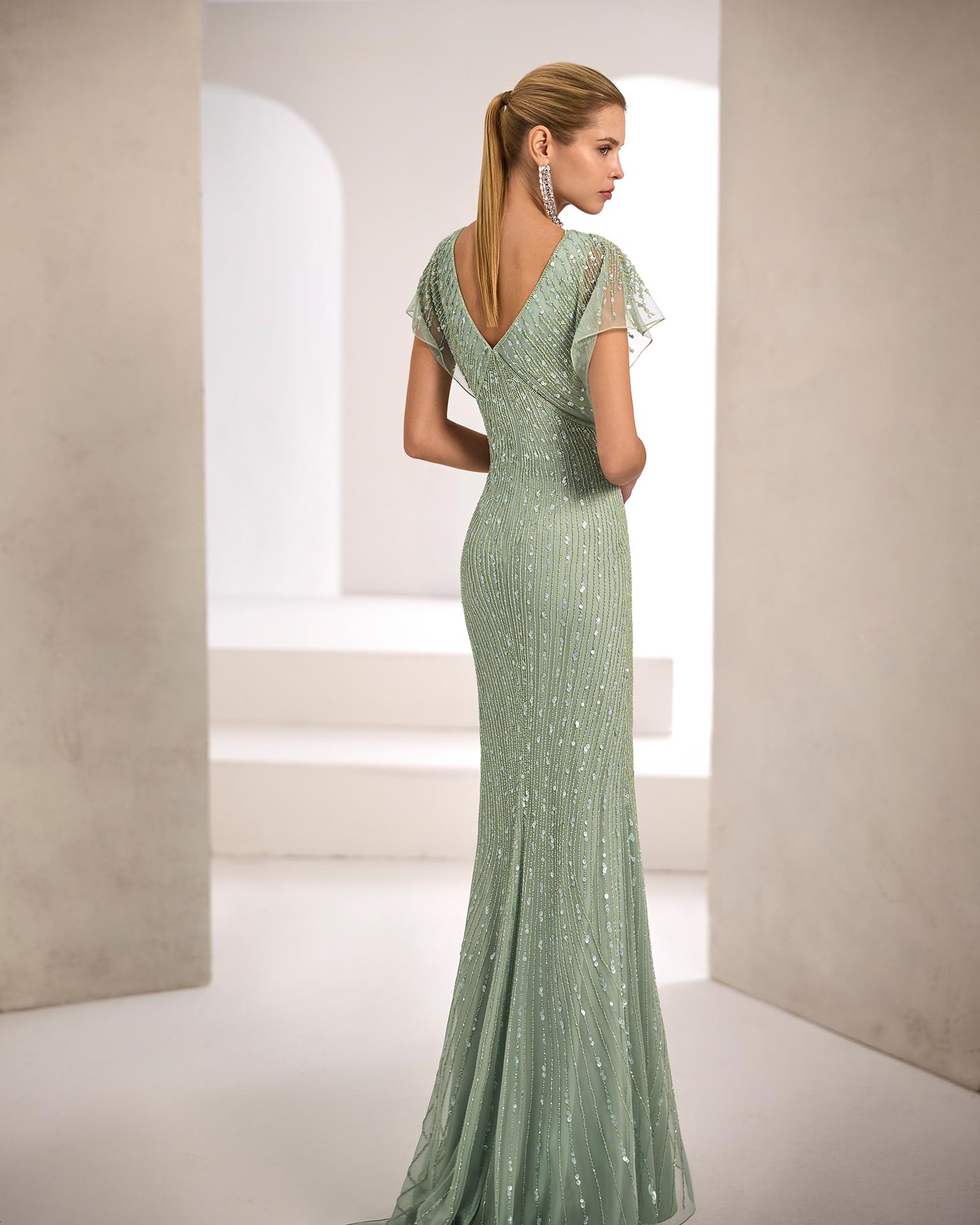 Long evening dress. Made of beaded fabric. V-neckline and butterfly sleeves. Includes shawl.