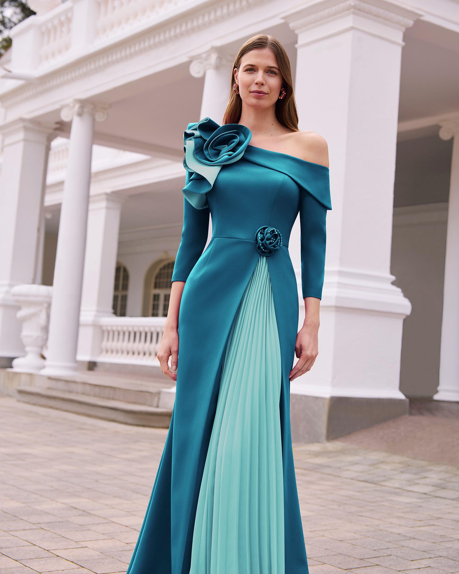 Vestido de fiesta largo, confeccionado en crepé con georgette. Con escote asimétrico y manga francesa.