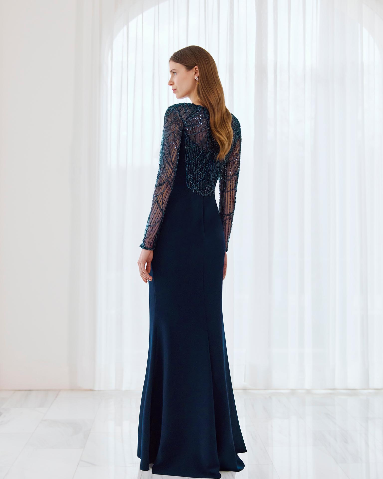 Vestido de fiesta largo, confeccionado en crepé y pedrería. Con escote barco, manga larga y espalda de pedrería.