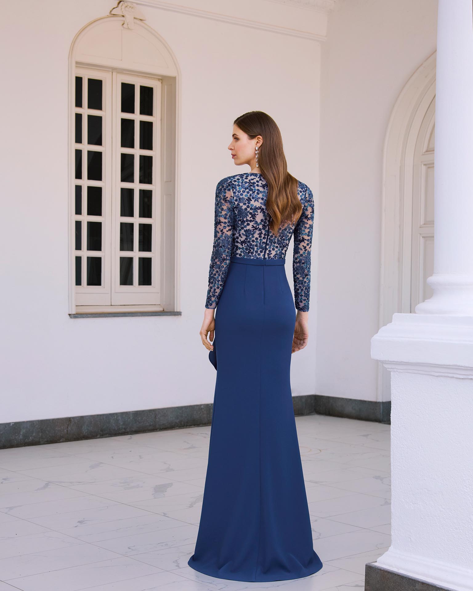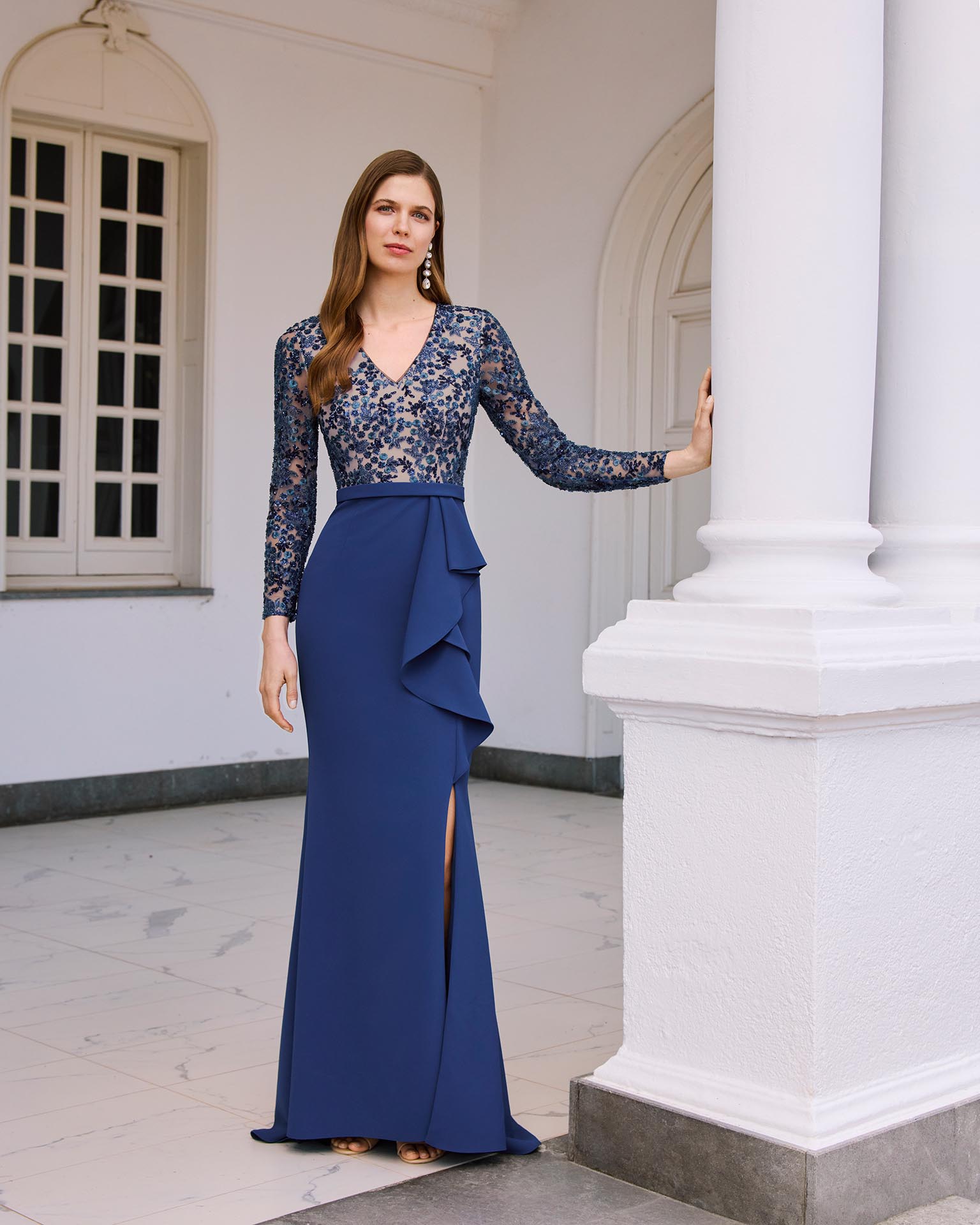 Vestido de fiesta largo, confeccionado en crepé y pedrería. Con escote en V, manga larga y espalda cerrada.