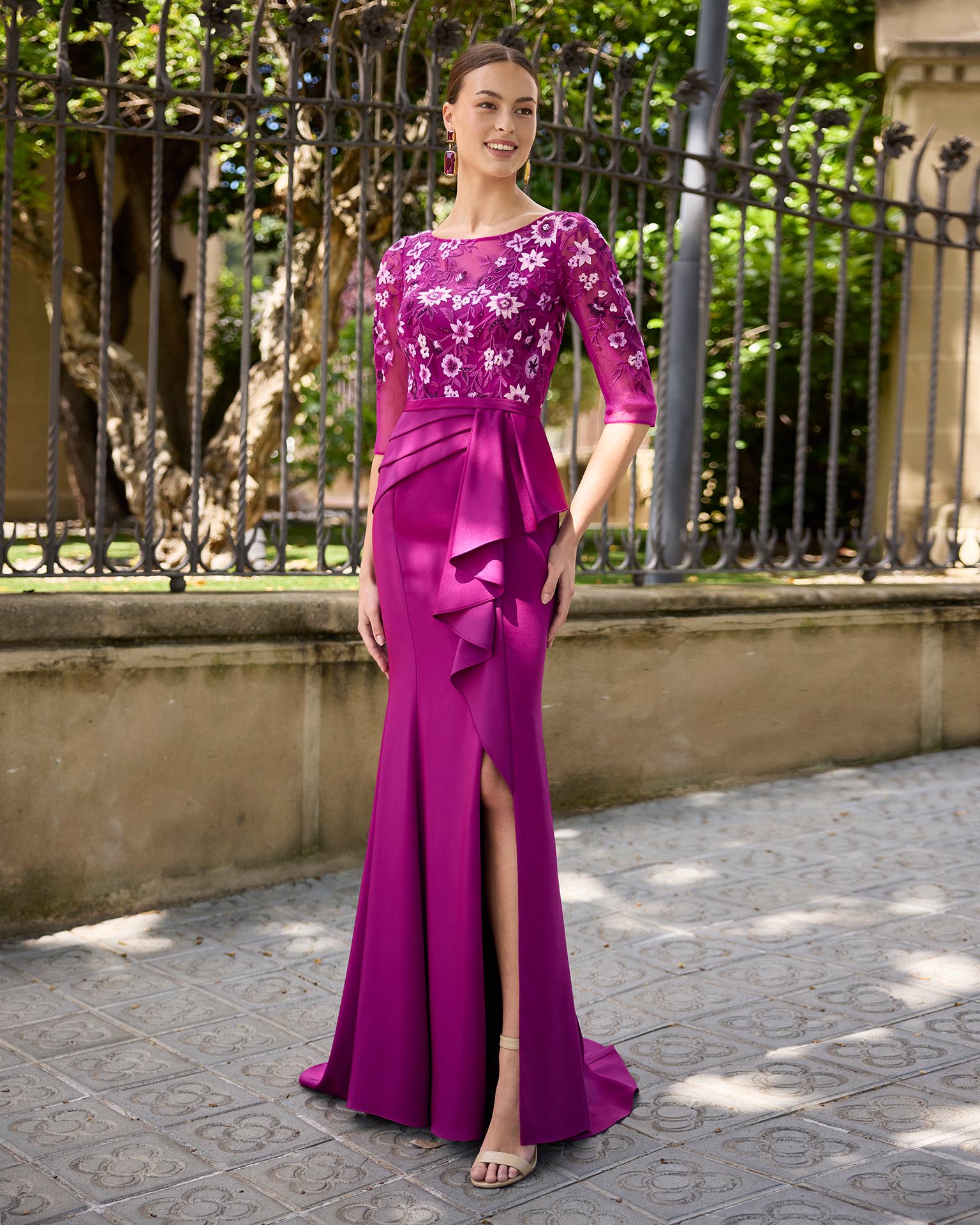 Vestido de fiesta largo, confeccionado en crepé satén y encaje pedrería. Con escote barco, manga francesa y espalda cerrada.