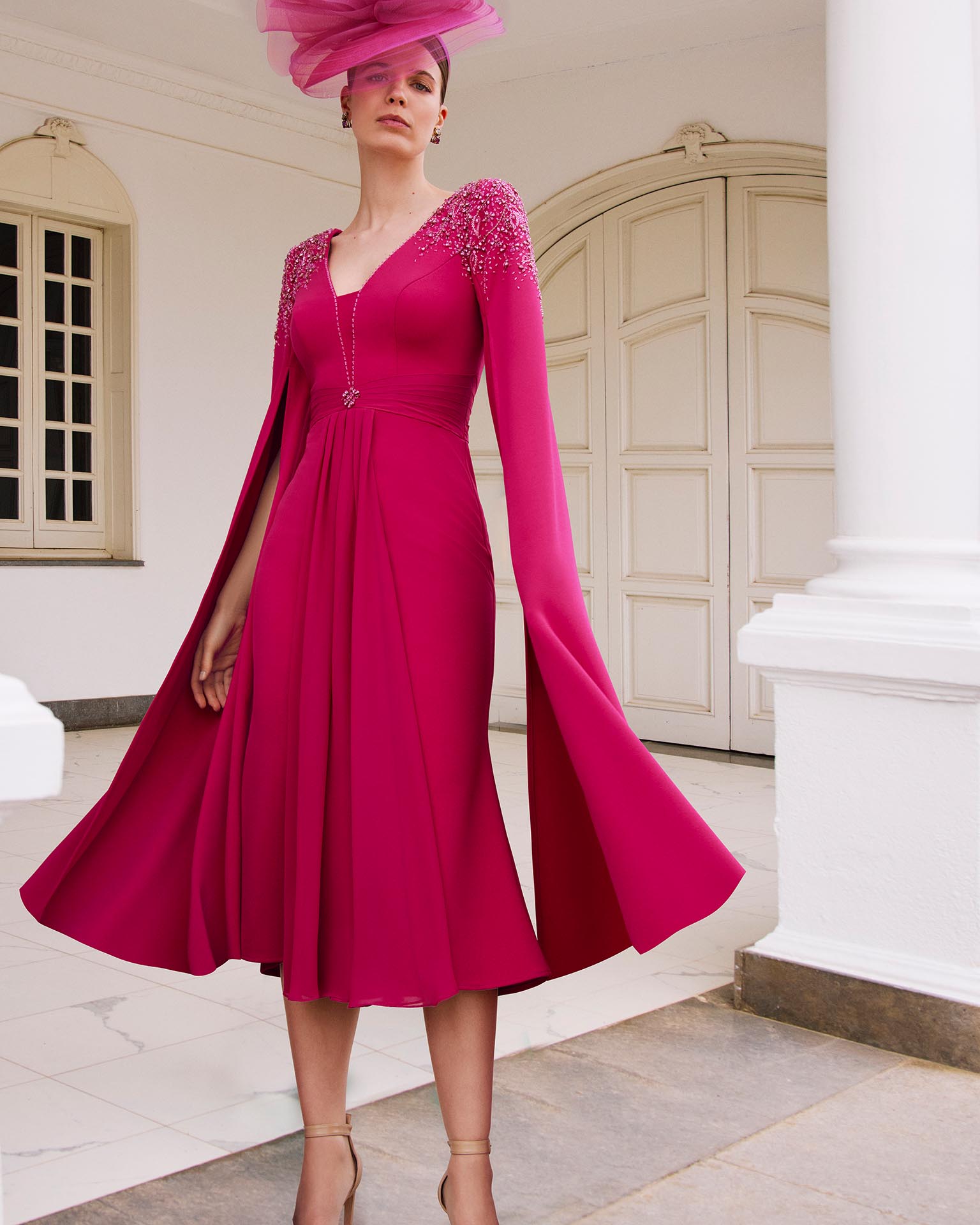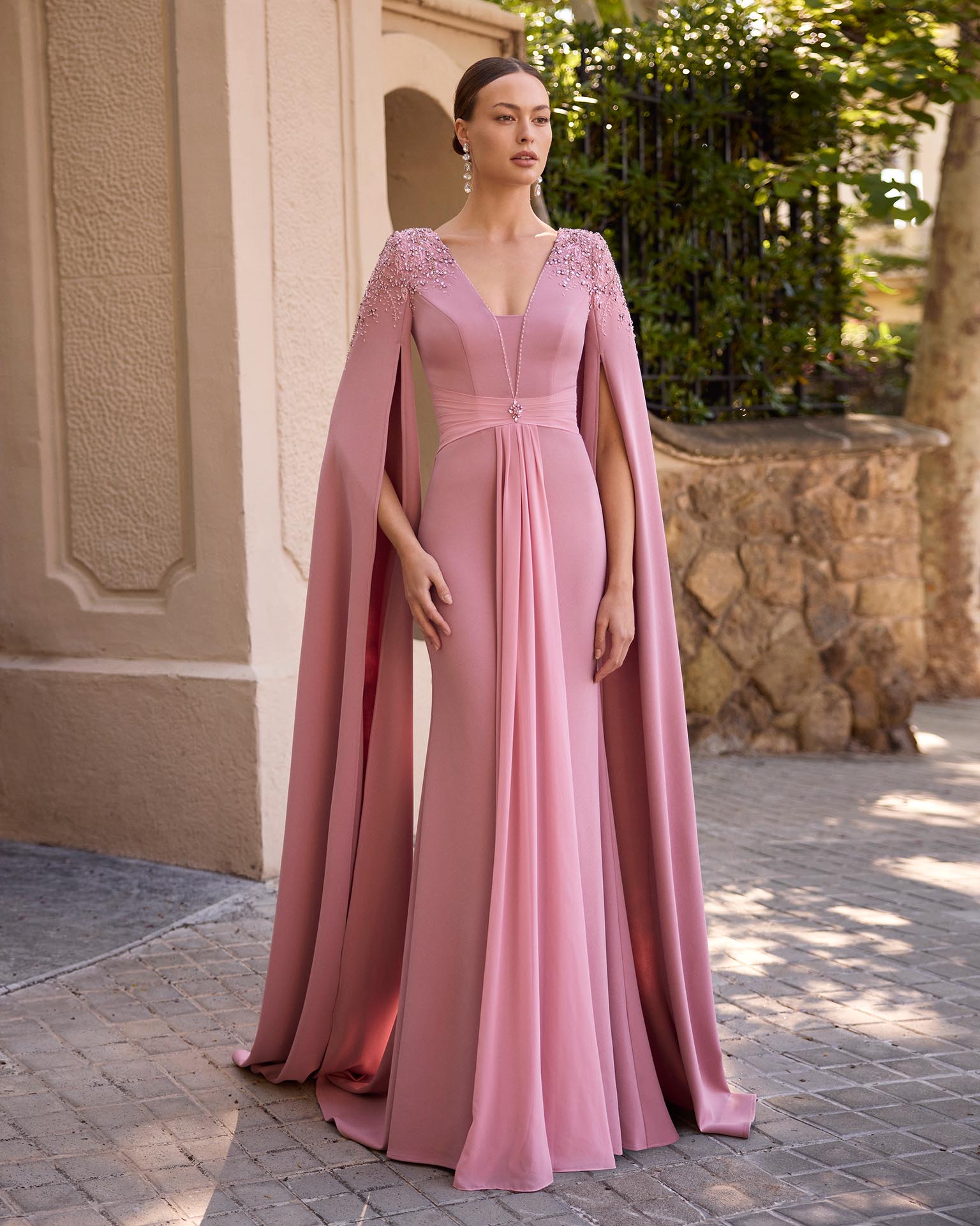 Vestido de fiesta largo, dos piezas confeccionado en crepé elástico. Con escote en V, tirantes y espalda cerrada. Con capa.