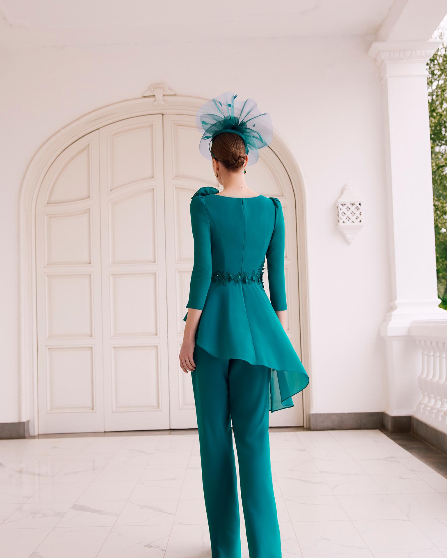 Blusa y pantalón de fiesta, dos piezas confeccionado en gasa. Con escote asimétrico, manga larga y espalda cerrada.