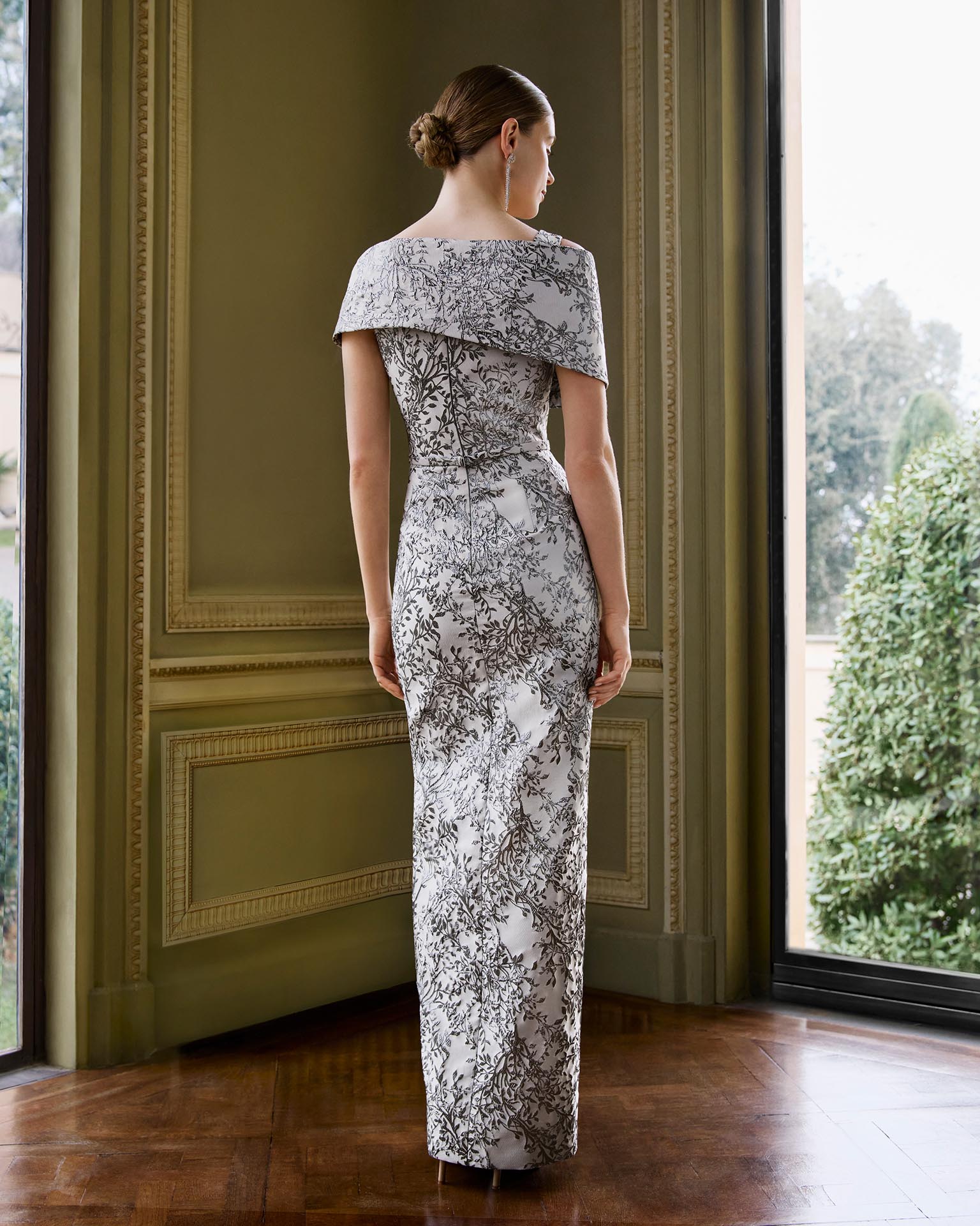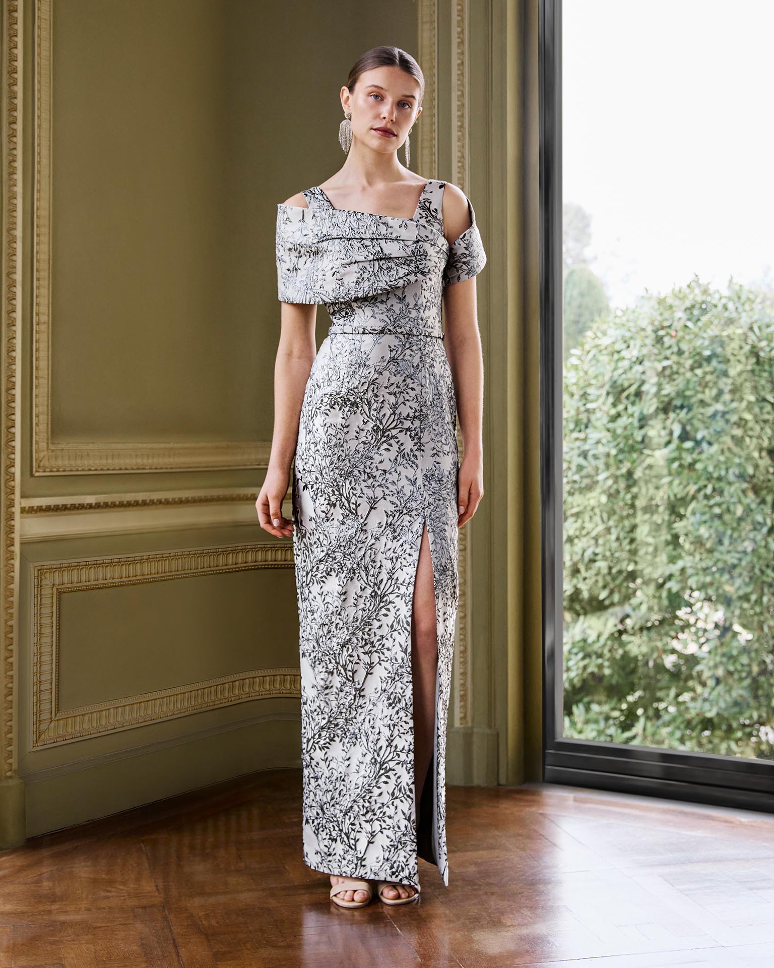 Vestido de fiesta largo, confeccionado en brocado. Con escote envolvente, tirantes y falda con abertura delantera.
