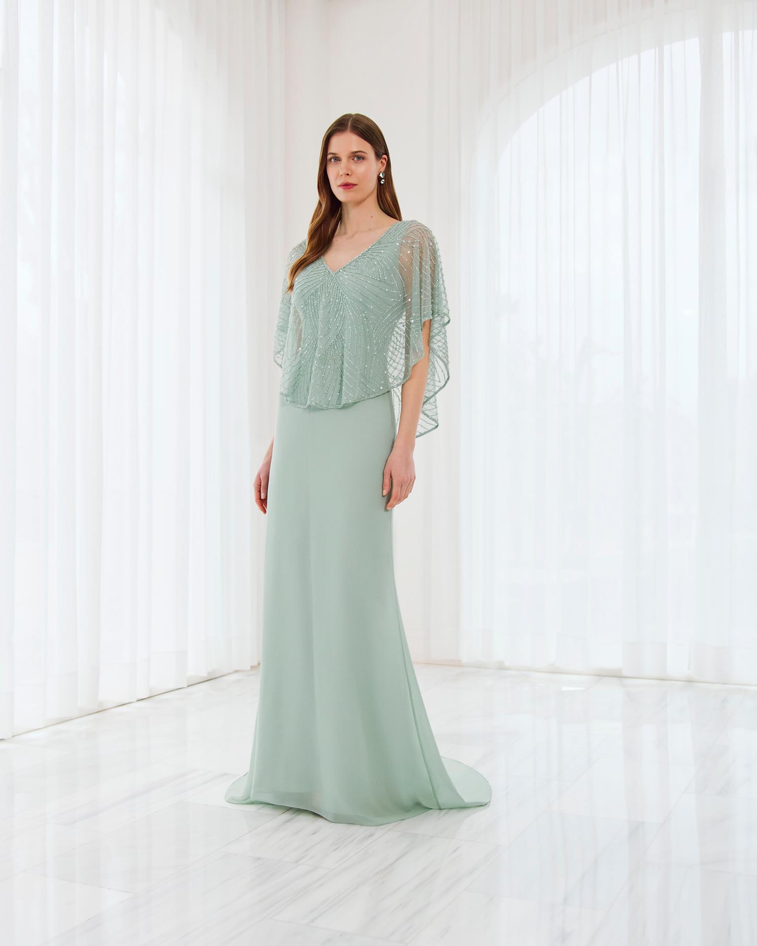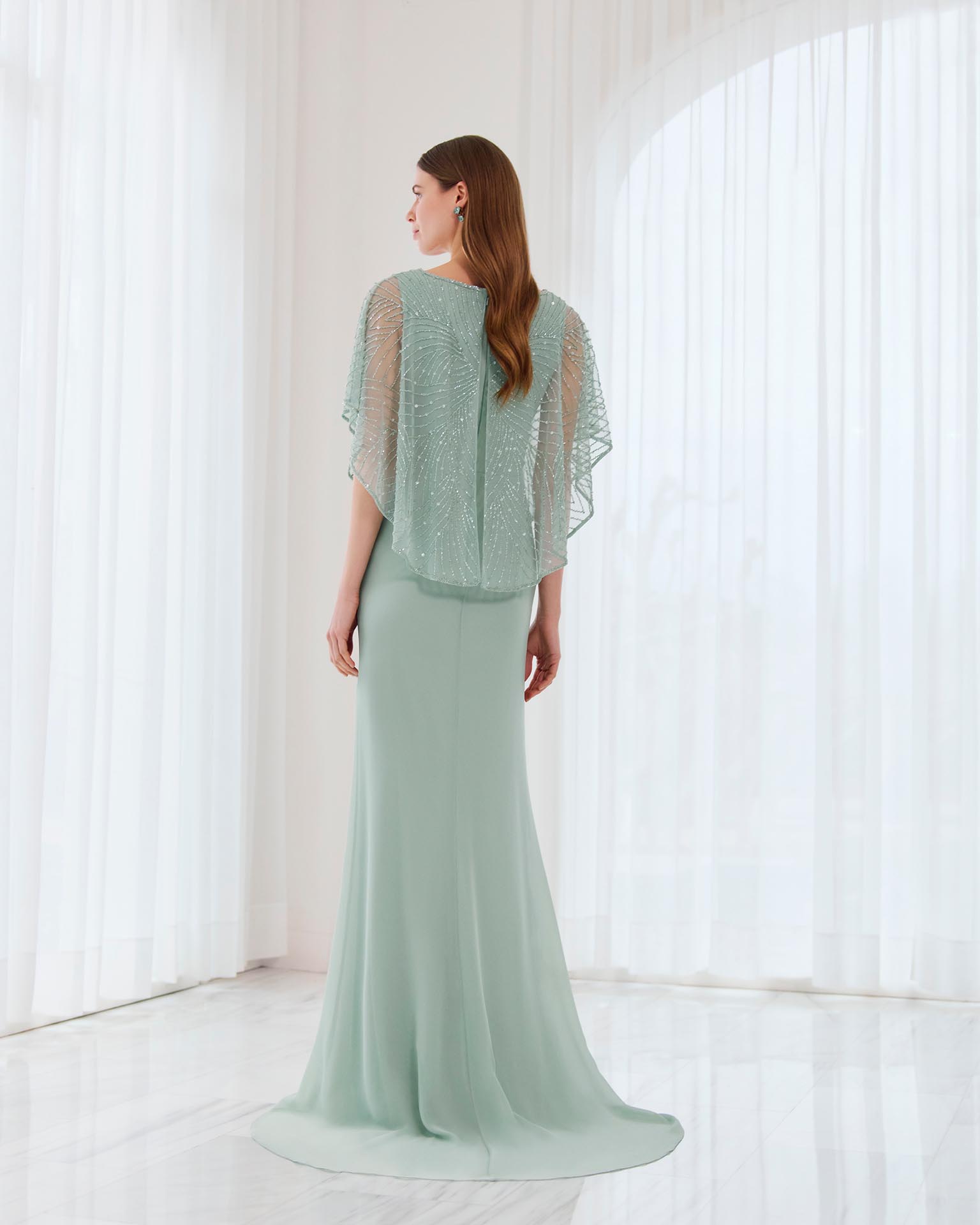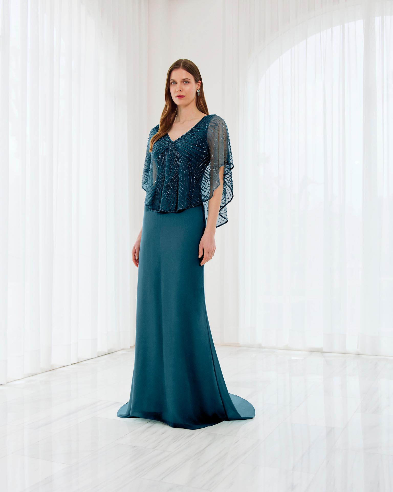 Vestido de fiesta largo, confeccionado en gasa con cuerpo capa y pedrería. Con escote en V, manga capa y espalda cerrada.