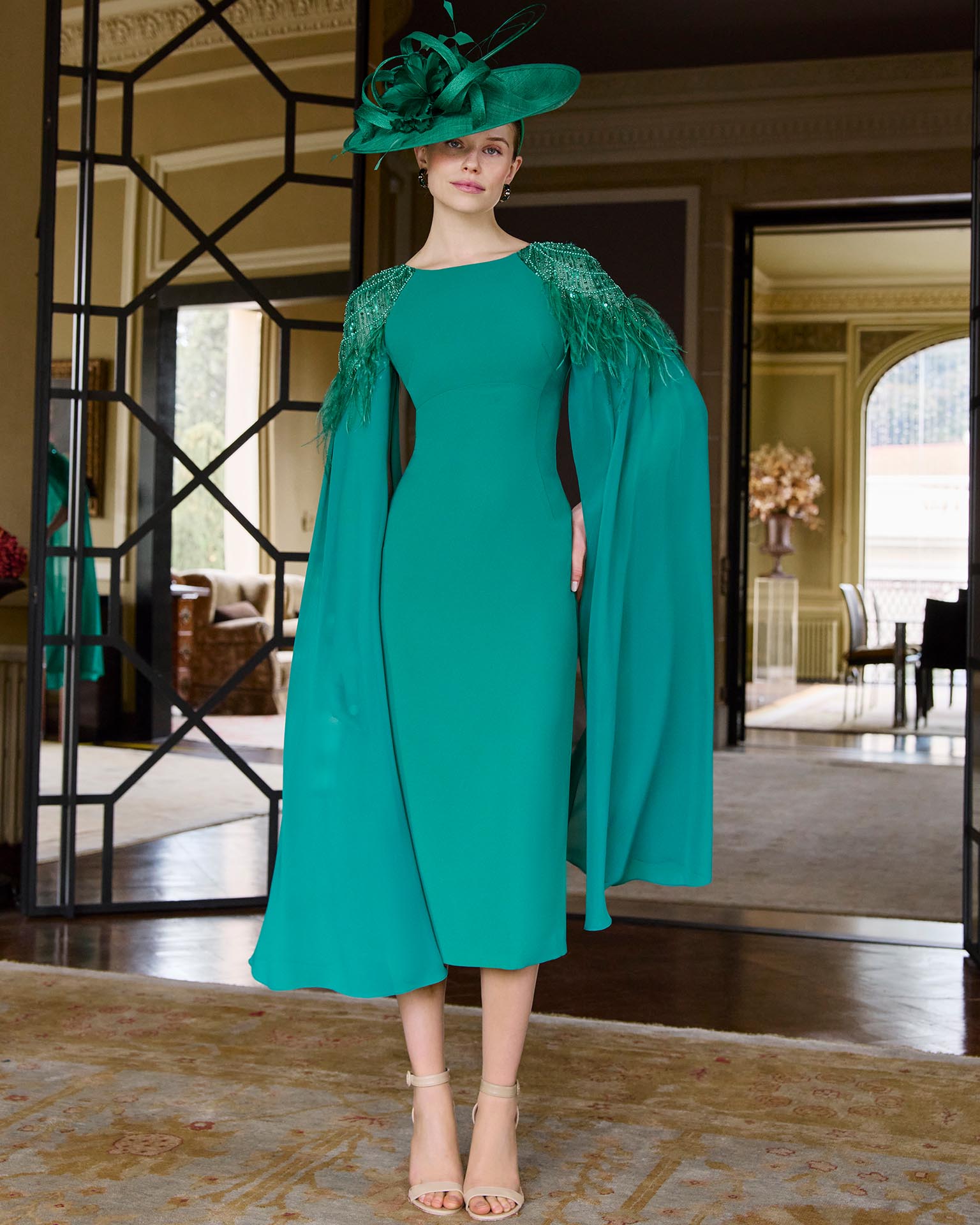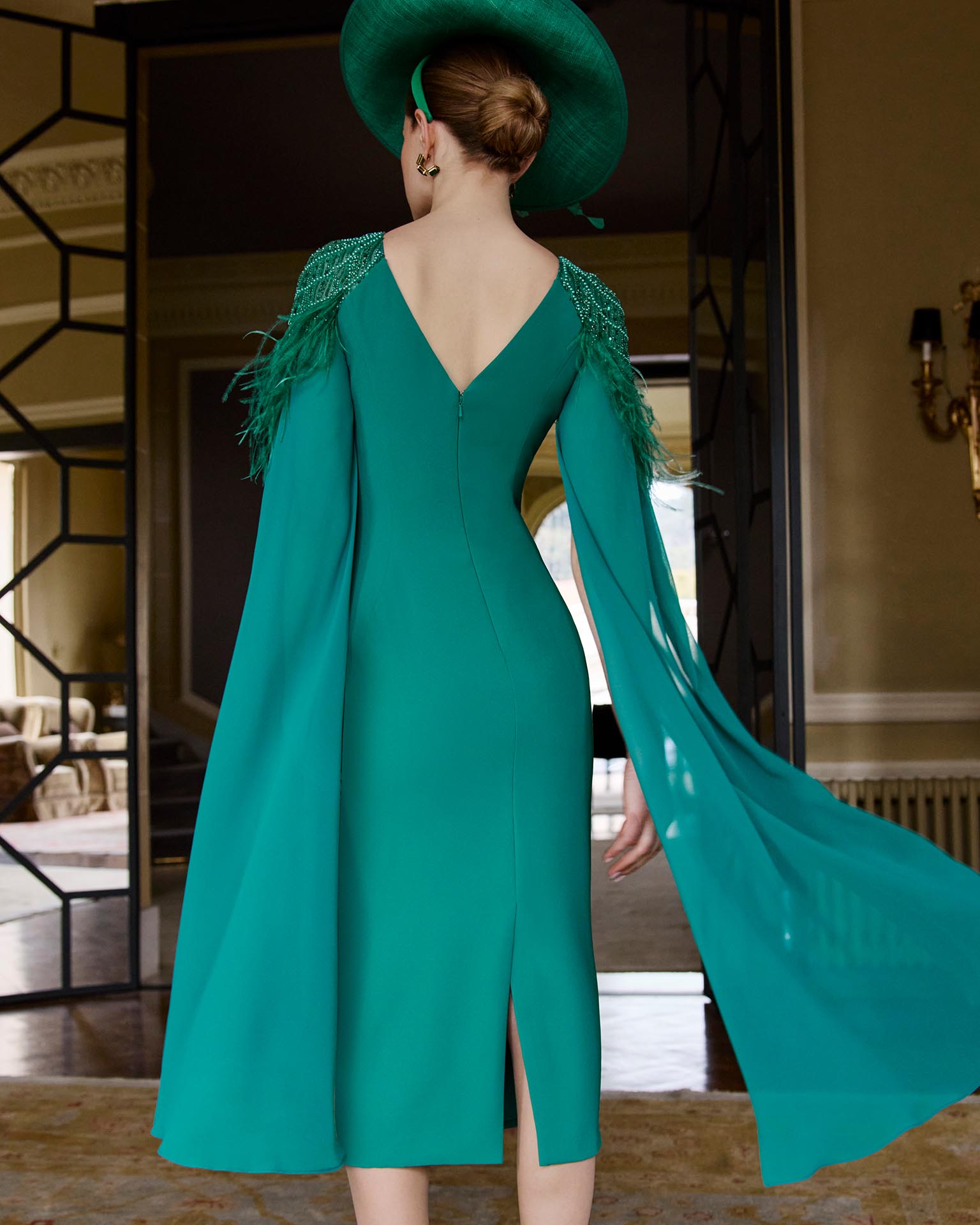Vestido de fiesta midi, confeccionado en crepé elástico con detalle de pedrería y plumas. Con escote barco, manga capa y espalda en V.