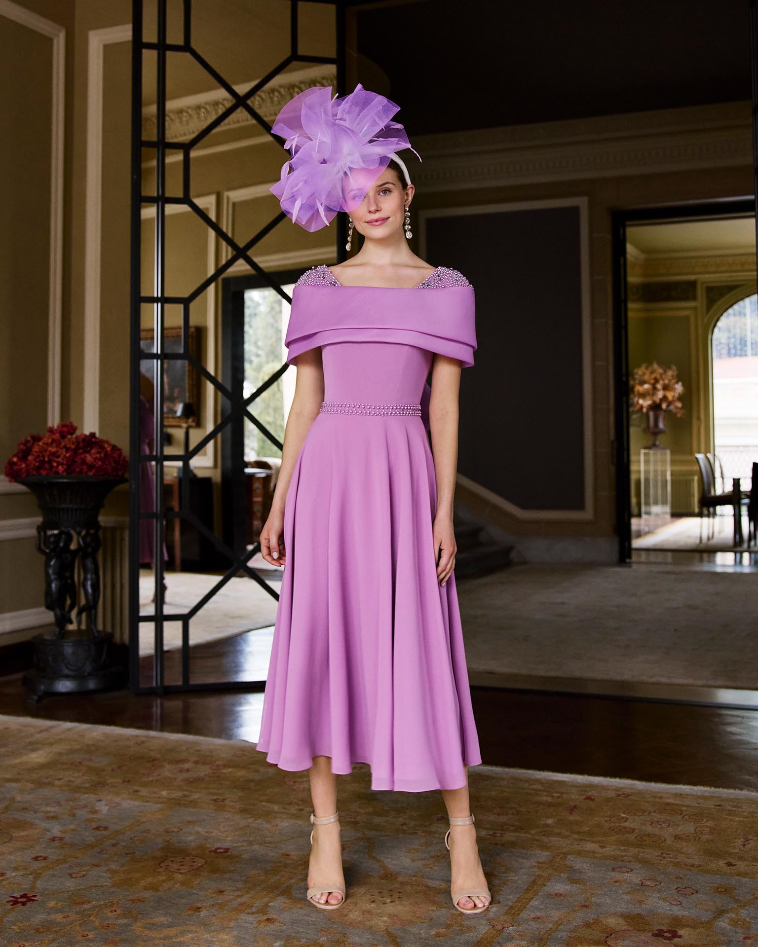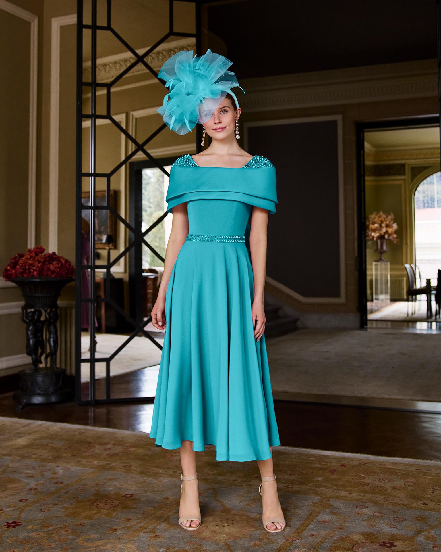 Vestido de fiesta midi, confeccionado en georgette con pedrería. Con escote envolvente, manga envolvente, espalda con adorno de lazo y chal.