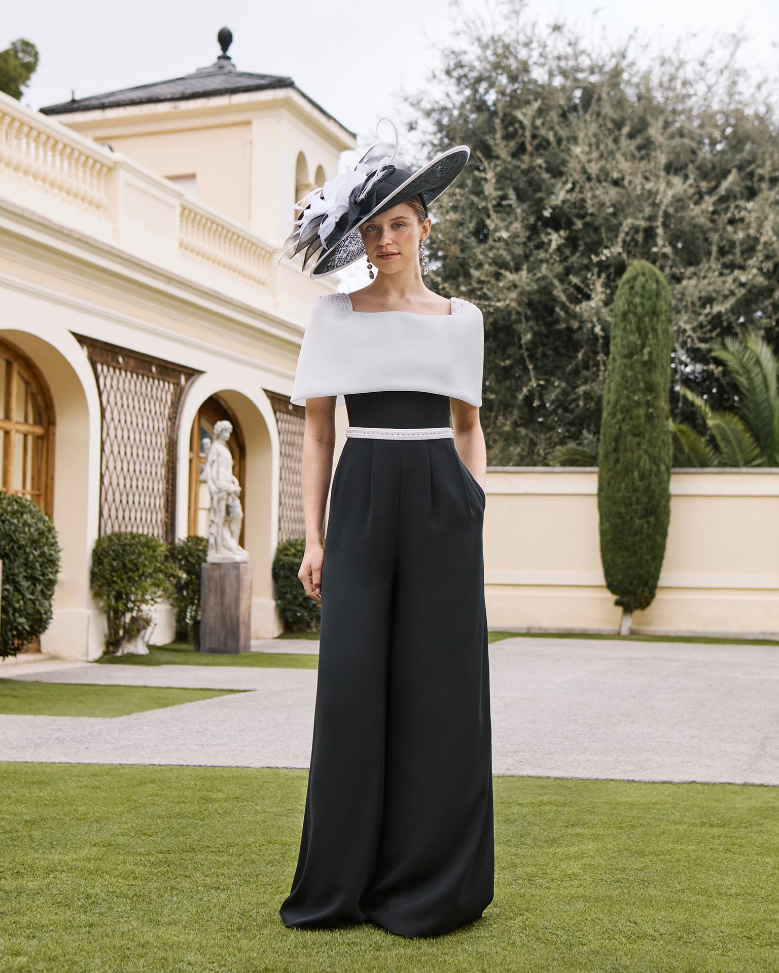 Mono de fiesta, confeccionado en crepé con pedrería. Con escote envolvente, manga envolvente y espalda con adorno de lazo.