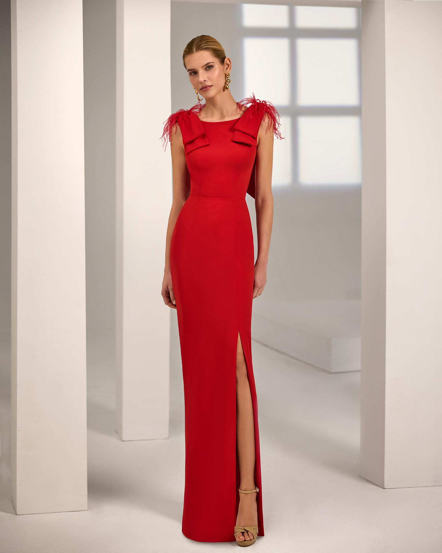 Vestido de fiesta largo. Confeccionado en crepé. Escote redondo y tirantes con lazos y plumas. Incluye chal.