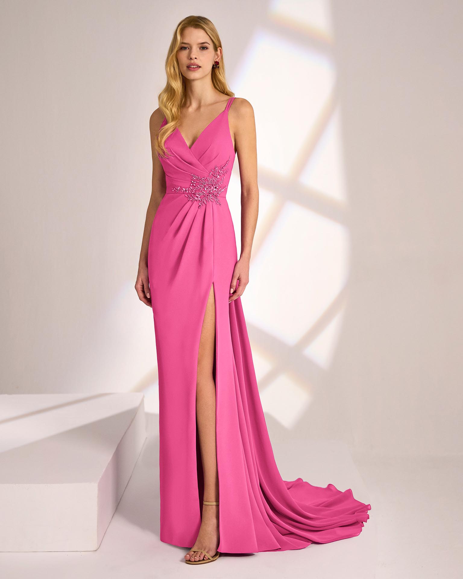 Vestido de fiesta largo, confeccionado en crepé elástico. Escote en pico con tirantes dobles. Detalle pedrería en lateral. Incluye cola extraíble y chal.