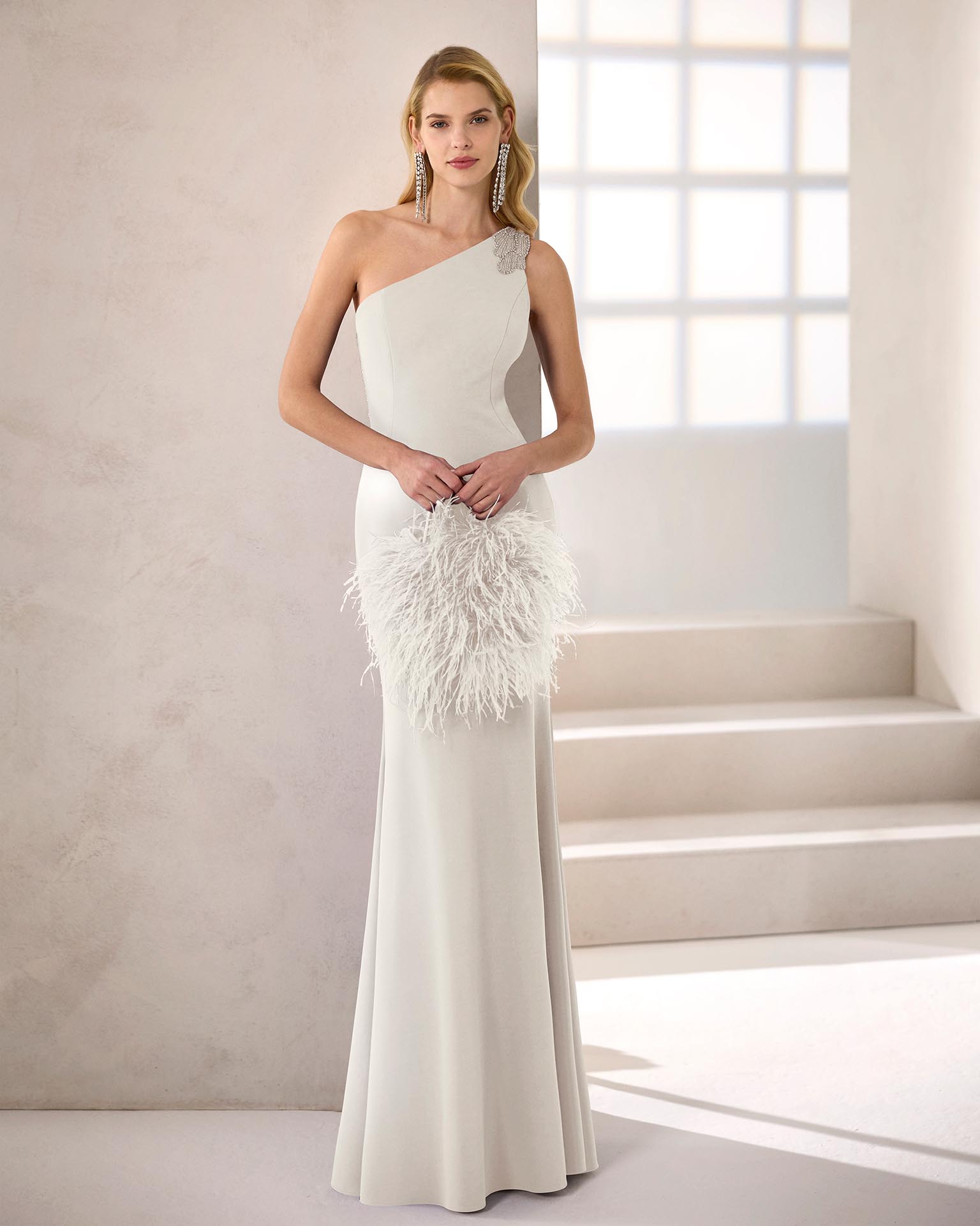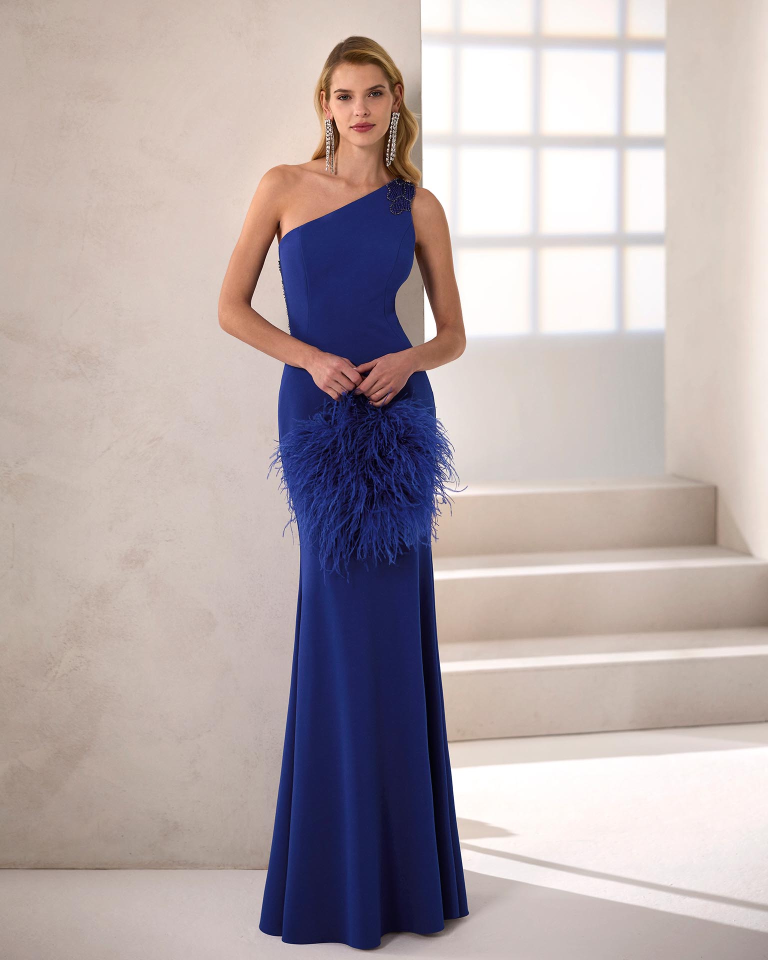 Vestido de fiesta largo. Confeccionado en crepé satén. Escote asimétrico, tirantes y espalda de pedrería. Incluye chal.