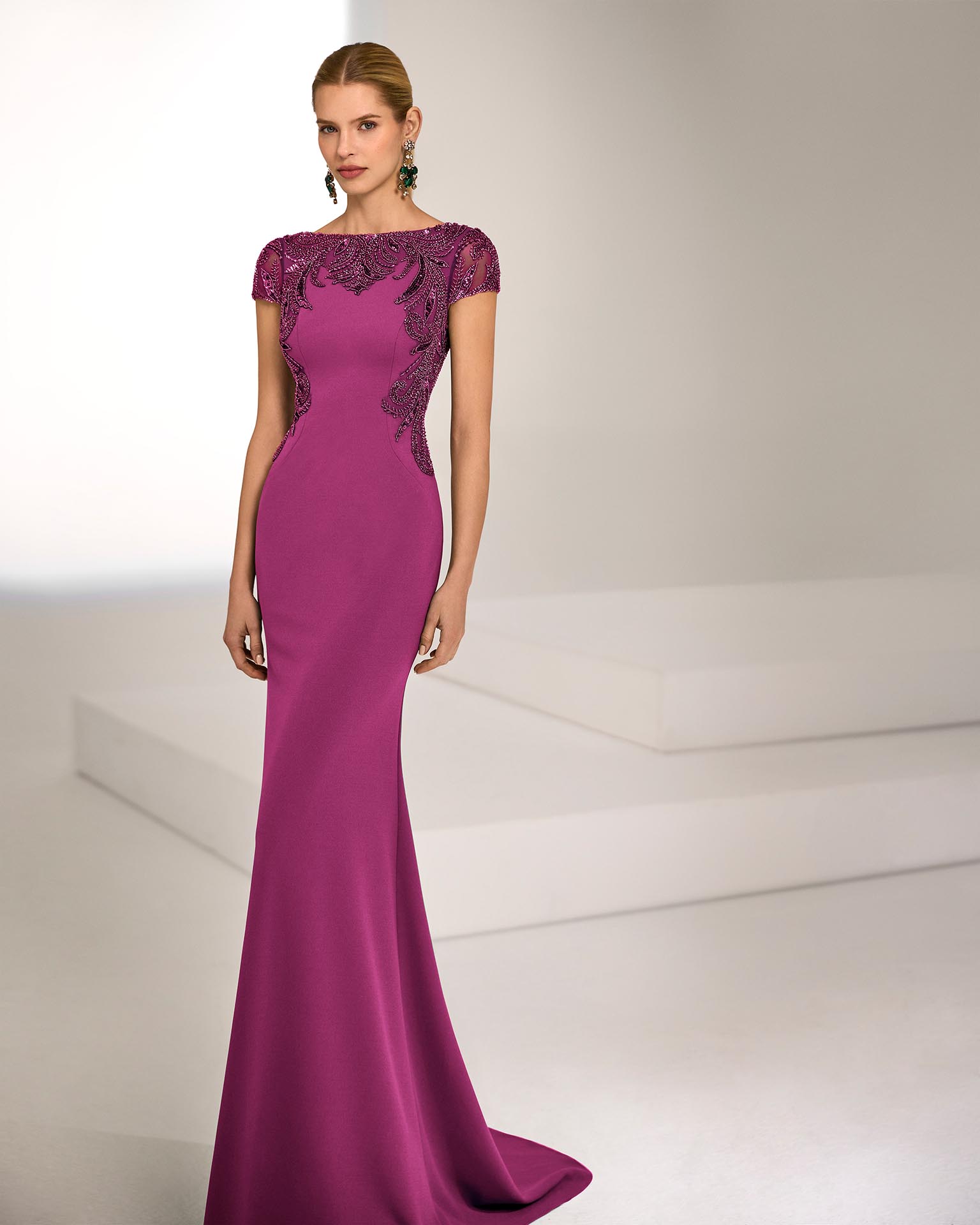 Vestido de fiesta largo. Confeccionado en crepé elástico. Escote barco y manga corta. Detalles con pedrería. Incluye chal.