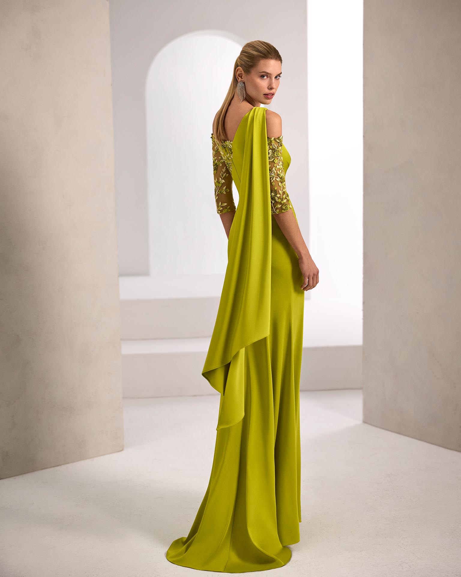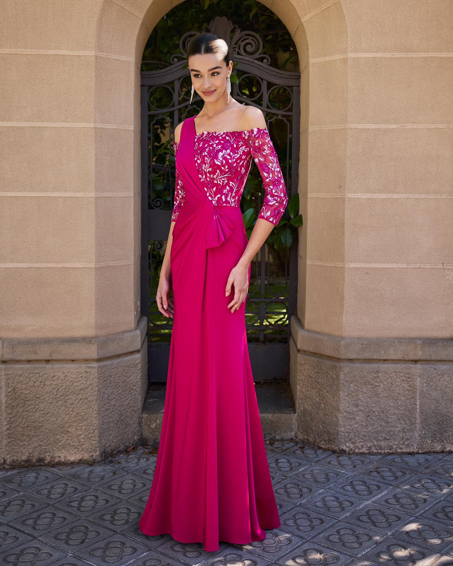Vestido de fiesta largo, confeccionado en crepé satinado. Escote asimétrico, manga francesa y encaje en cuerpo.