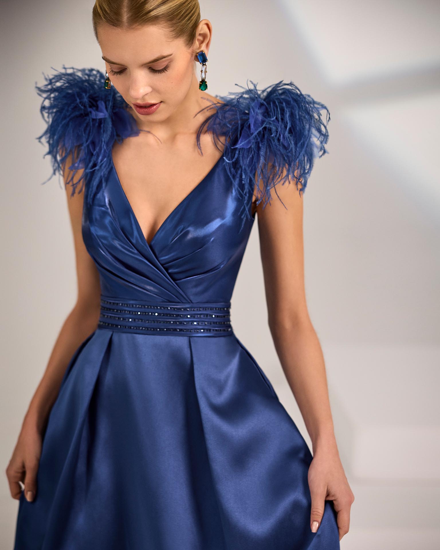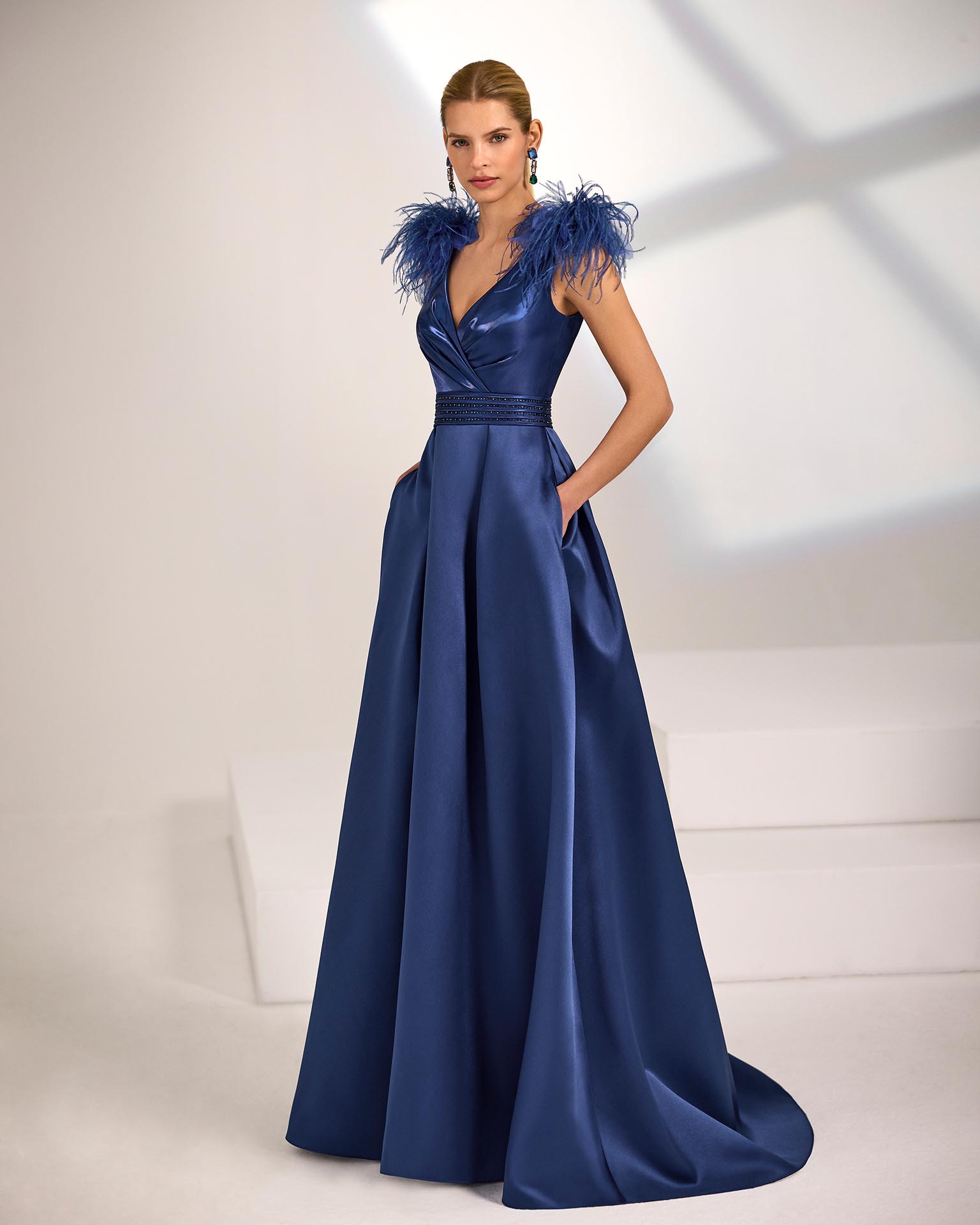 Vestido de fiesta largo. Confeccionado en mikado. Escote pico y espalda en V. Tirantes con plumas. Incluye chal.