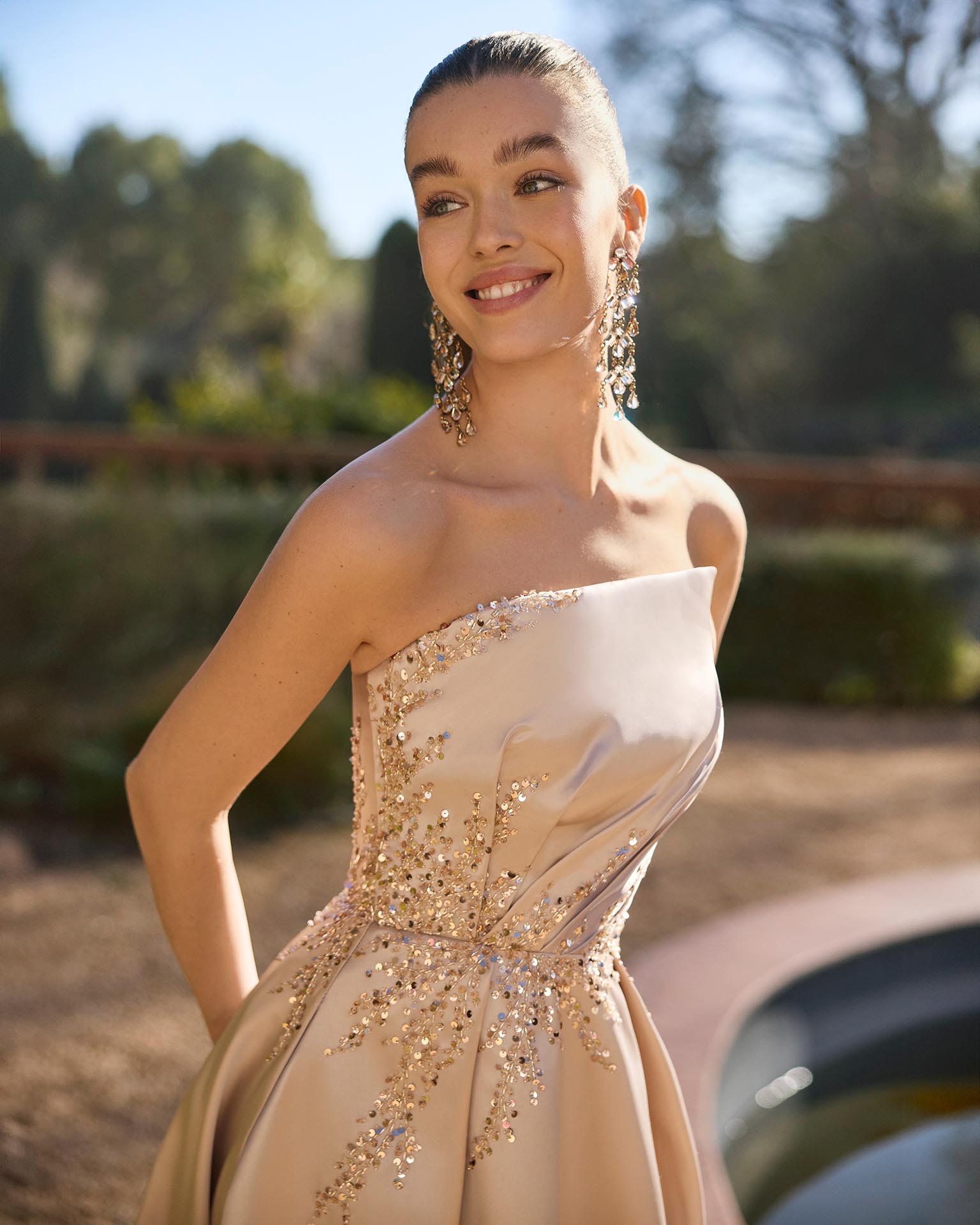 Vestido de fiesta largo. Confeccionado en mikado. Escote palabra de honor. Detalles de pedrería. Incluye chal.