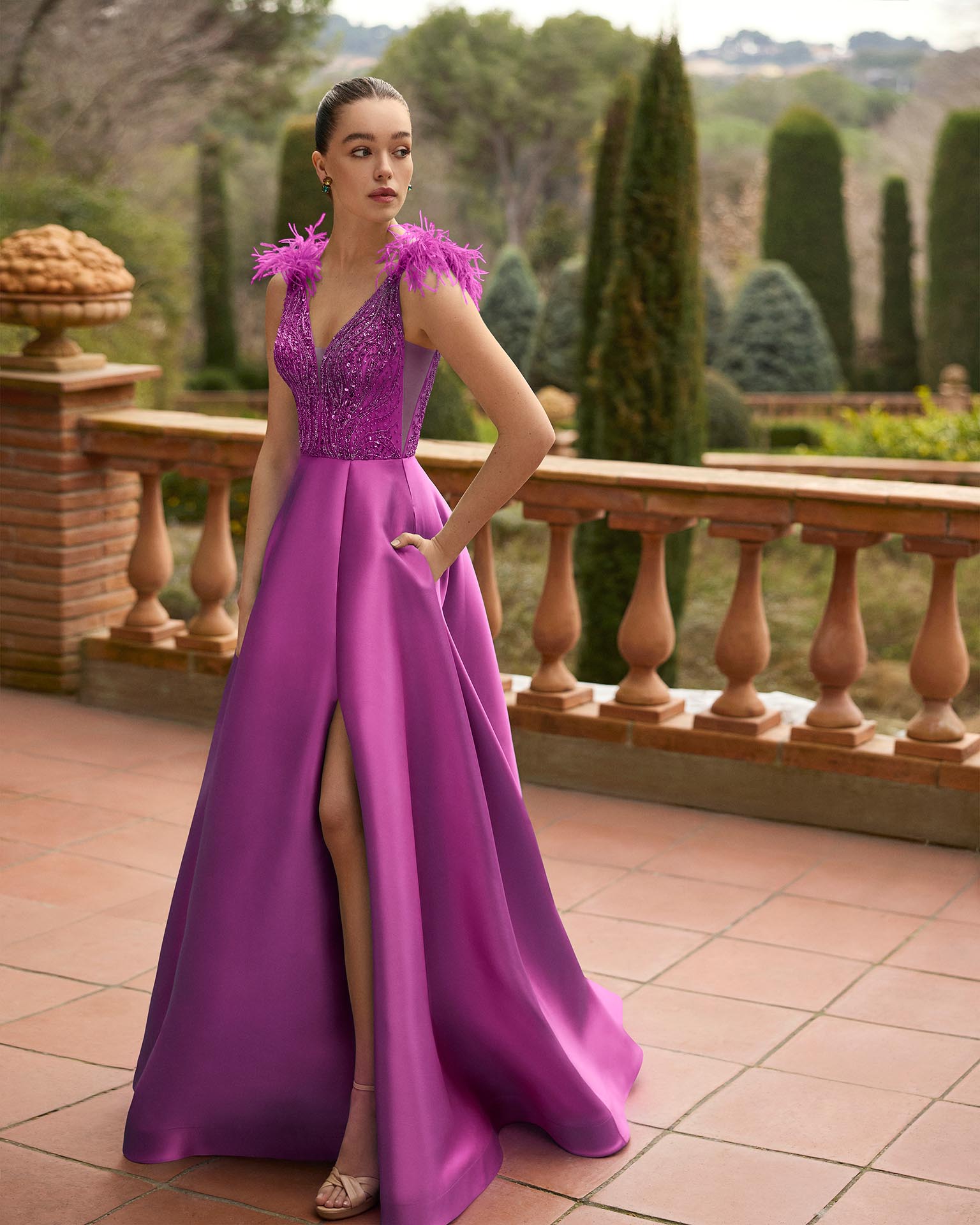 Vestido de fiesta largo. Confeccionado en mikado. Escote pico, tirantes y espalda escotada. Cuerpo con pedrería. Incluye chal.