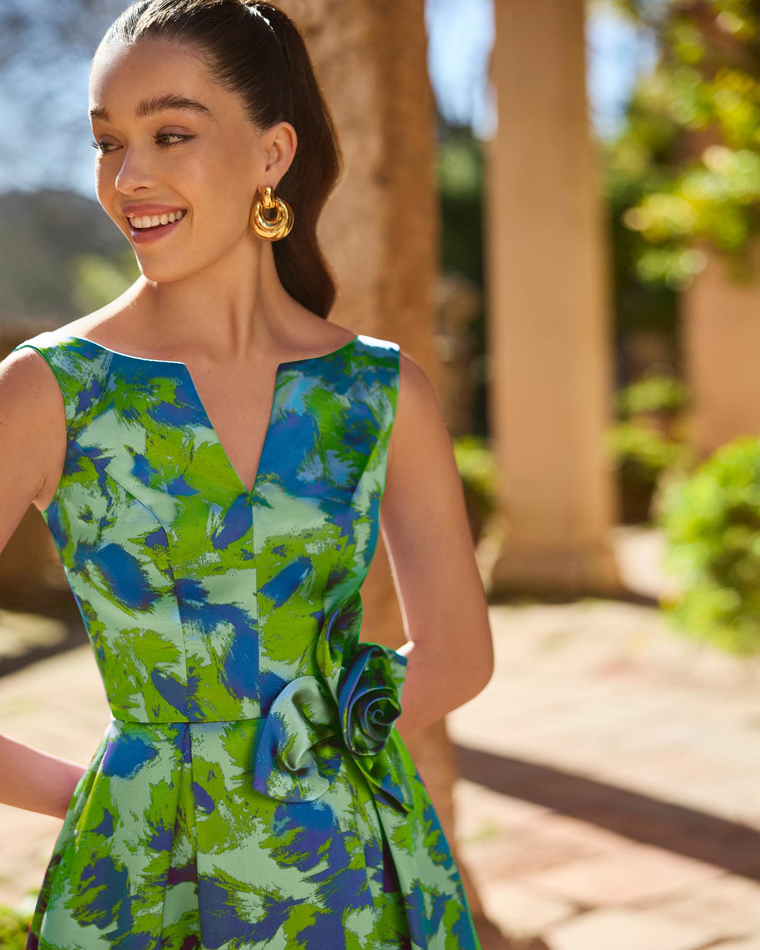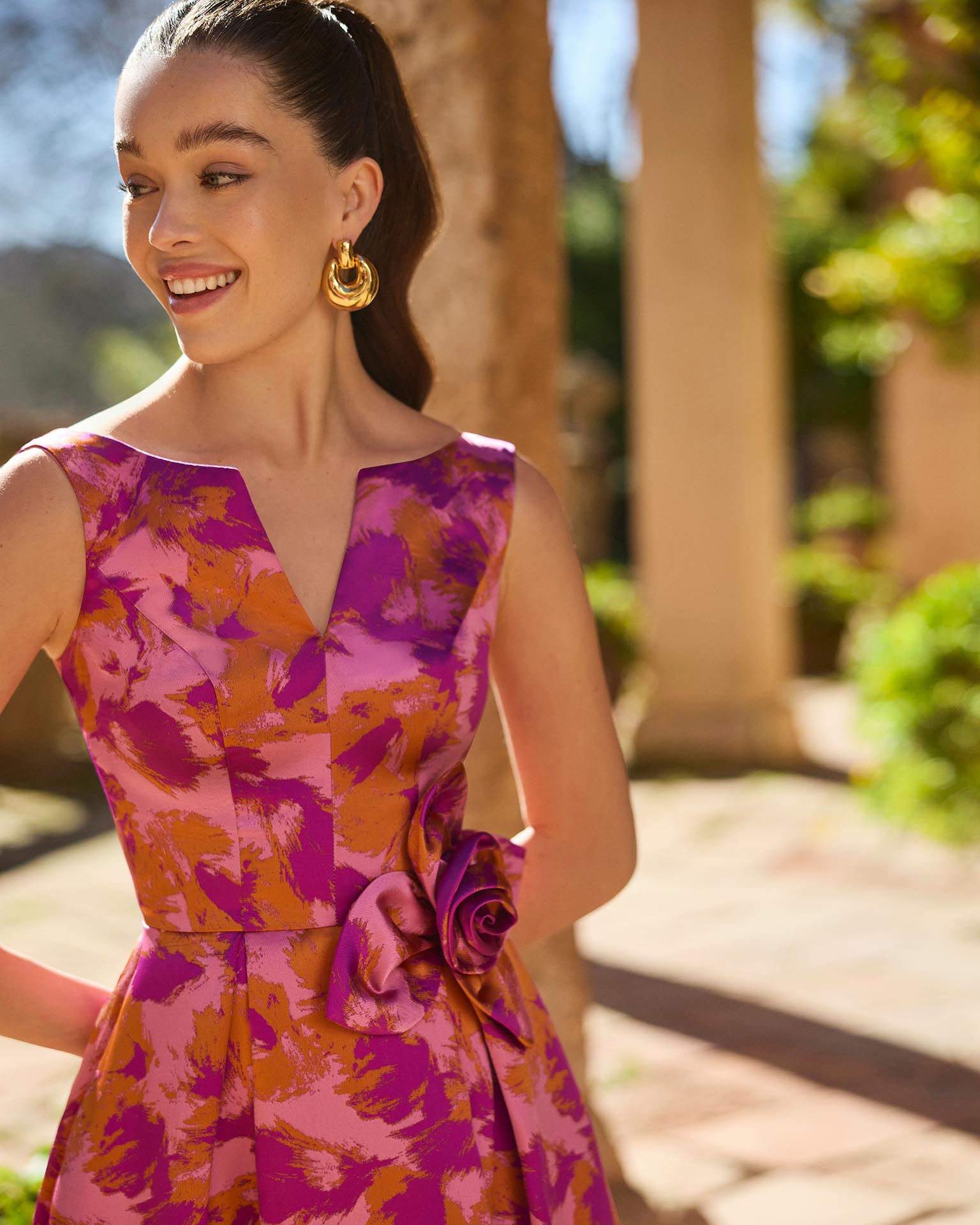 Vestido de fiesta largo. Confeccionado en brocado. Escote pico, espalda escotada con flor 3D en el lateral. Incluye chal.