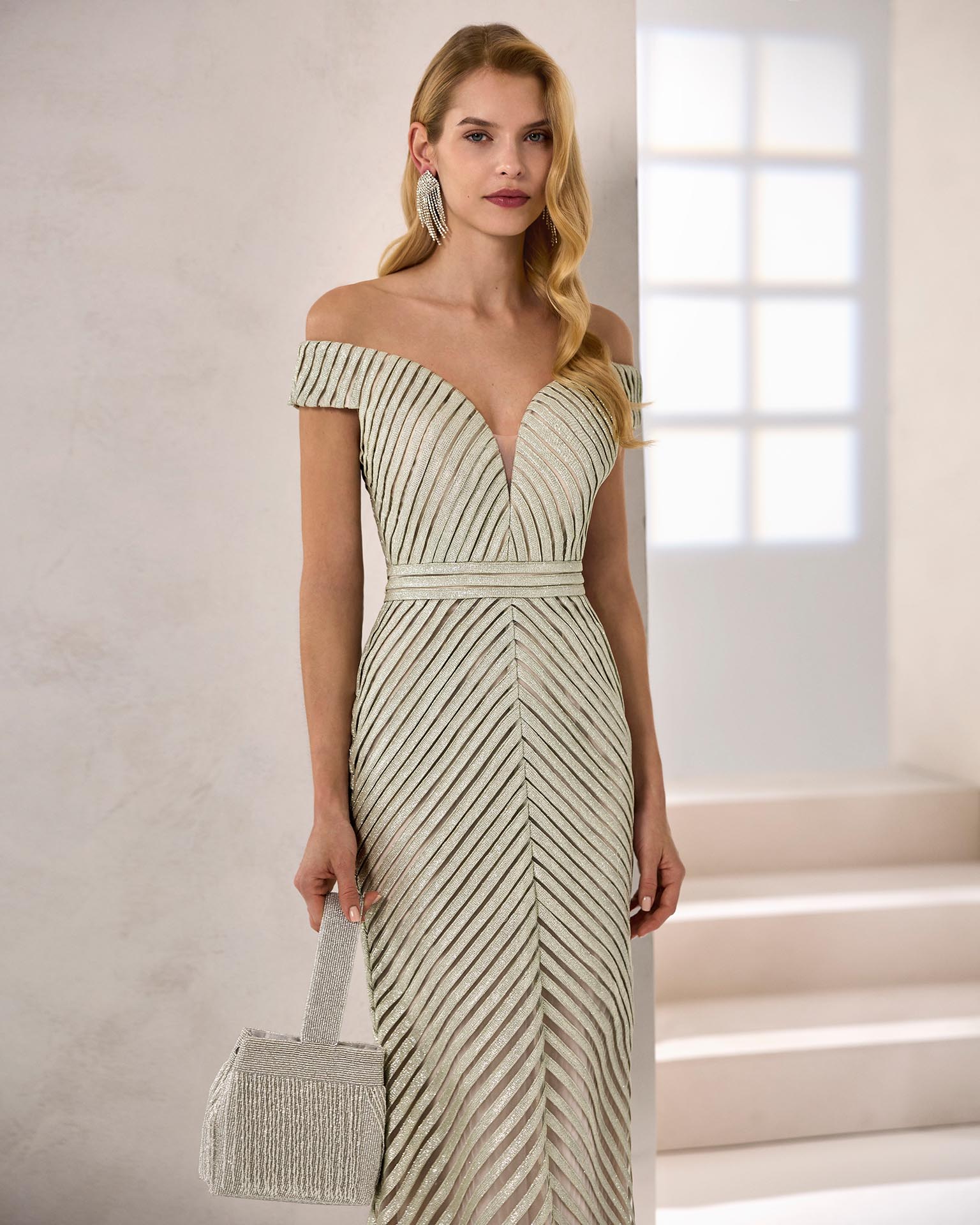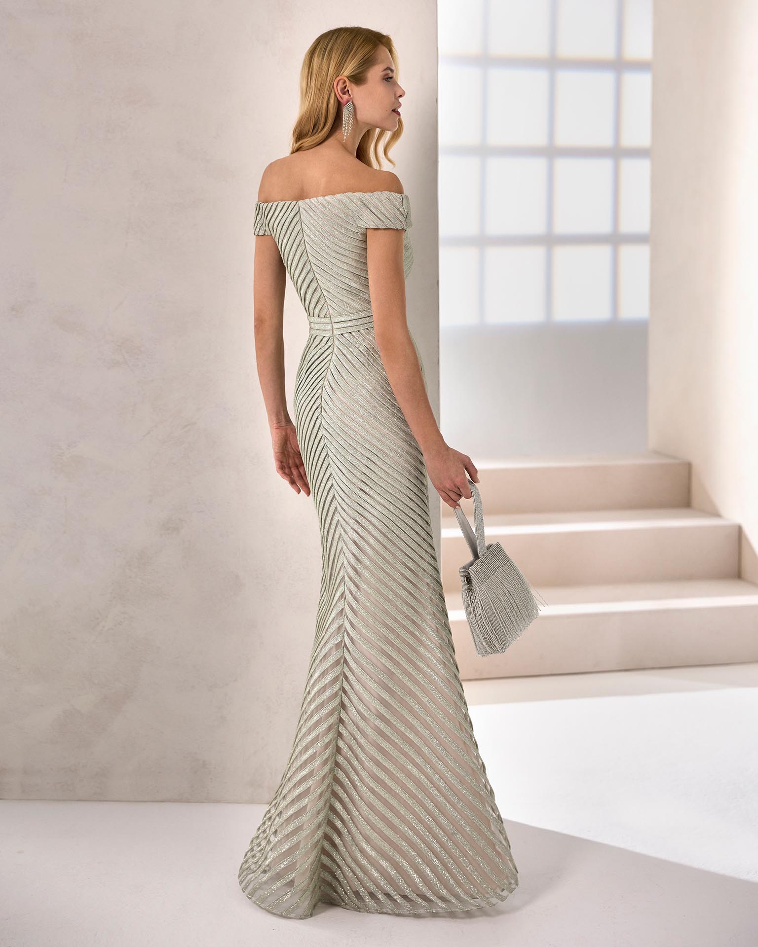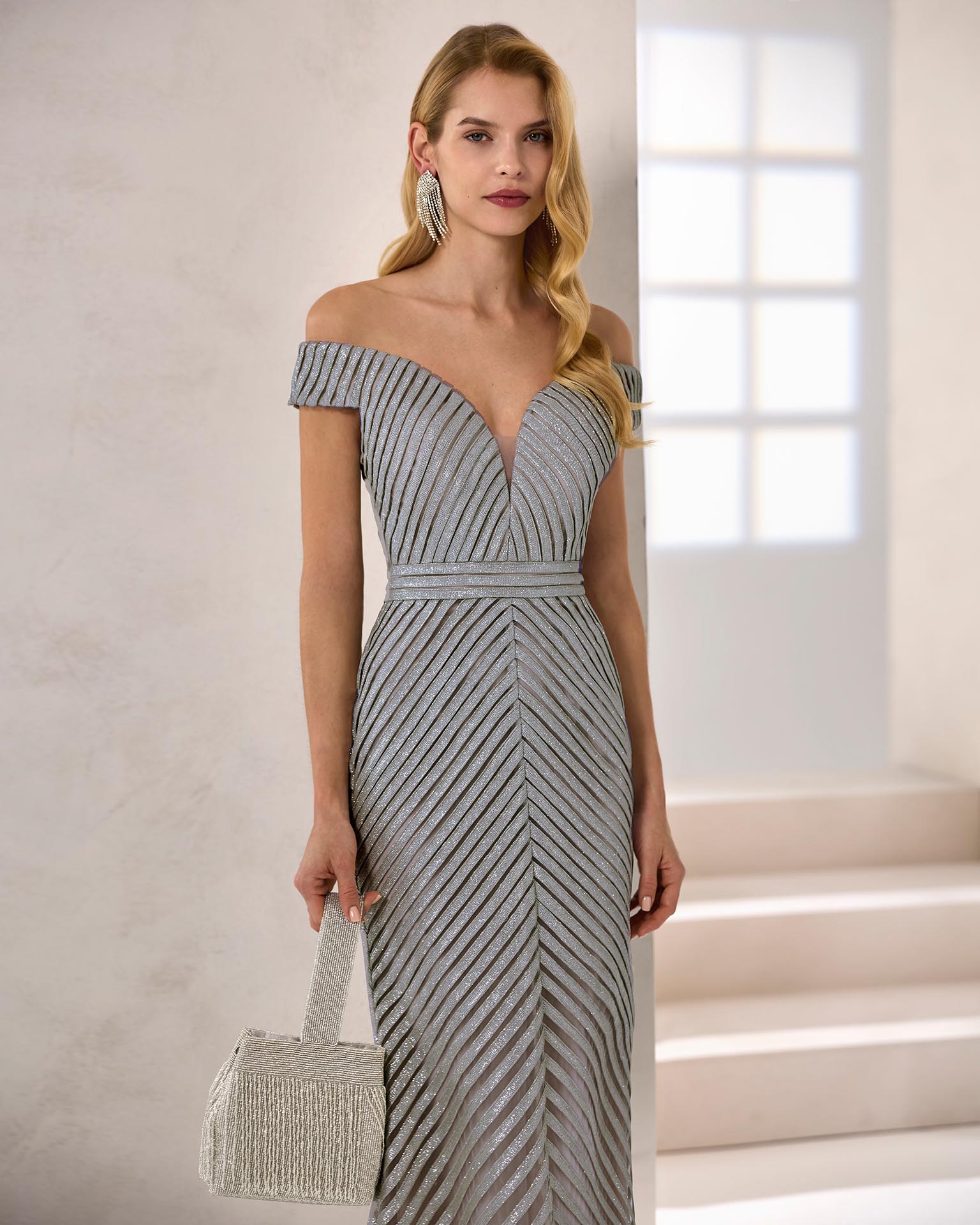 Vestido de fiesta largo. Confeccionado en otomán. Escote profundo y espalda cerrada. Incluye chal.