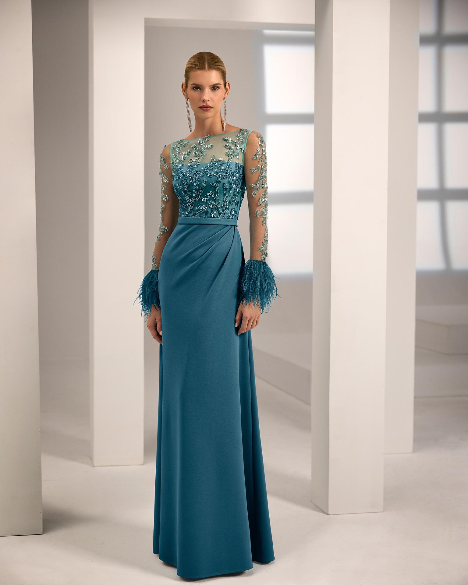 Vestido de fiesta largo. Confeccionado en crepé elástico. Cuerpo de pedrería. Manga larga con plumas. Espalda con abertura. Incluye chal.