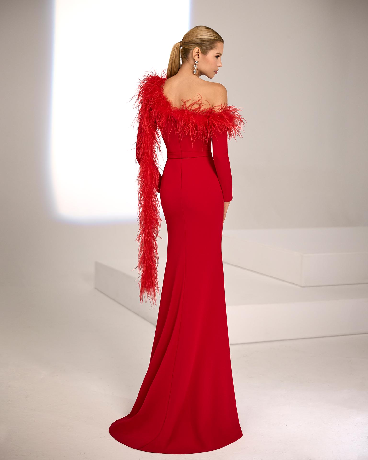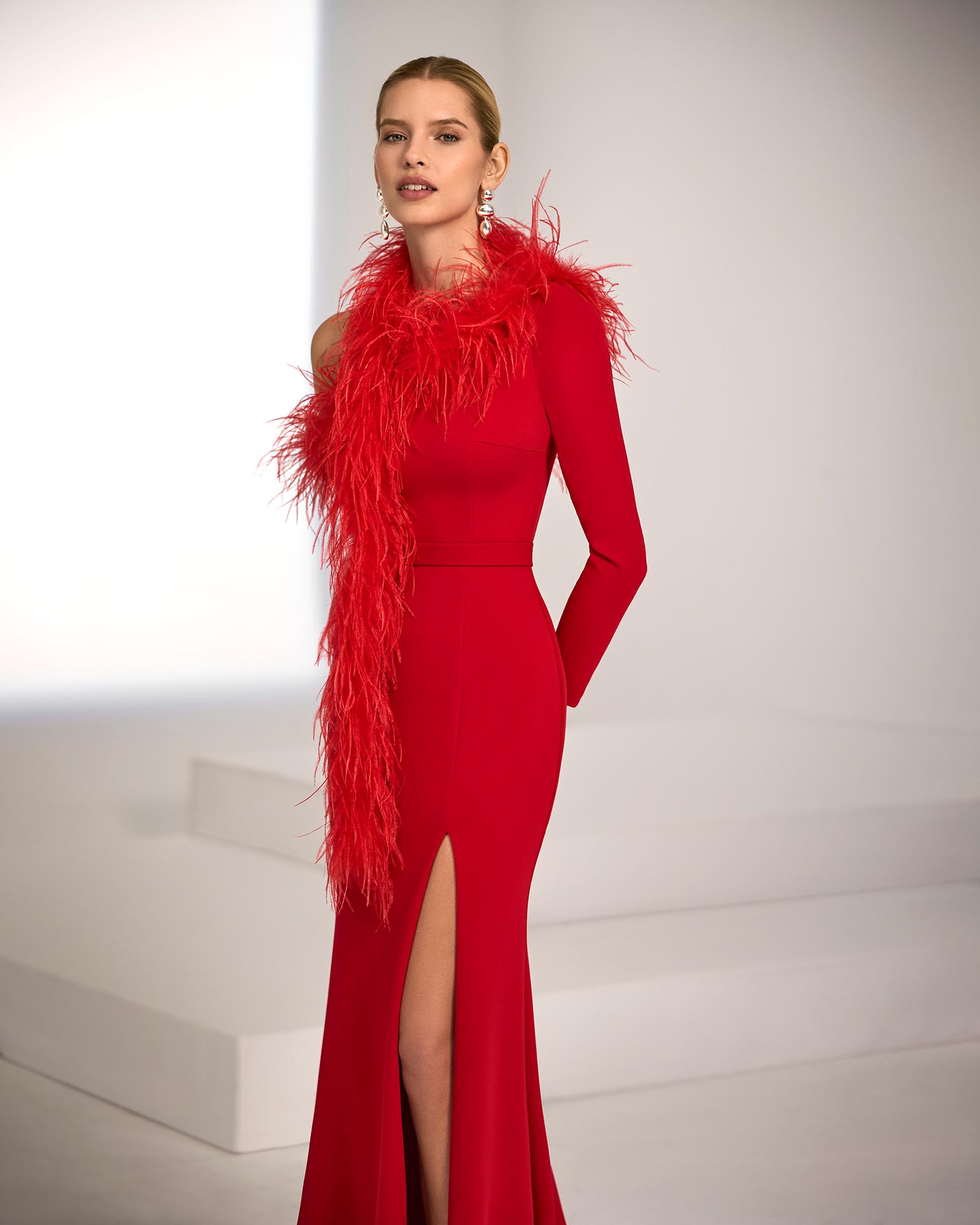Vestido de fiesta largo. Confeccionado en crepé elástico. Escote asimétrico. Manga larga con plumas. Incluye chal.