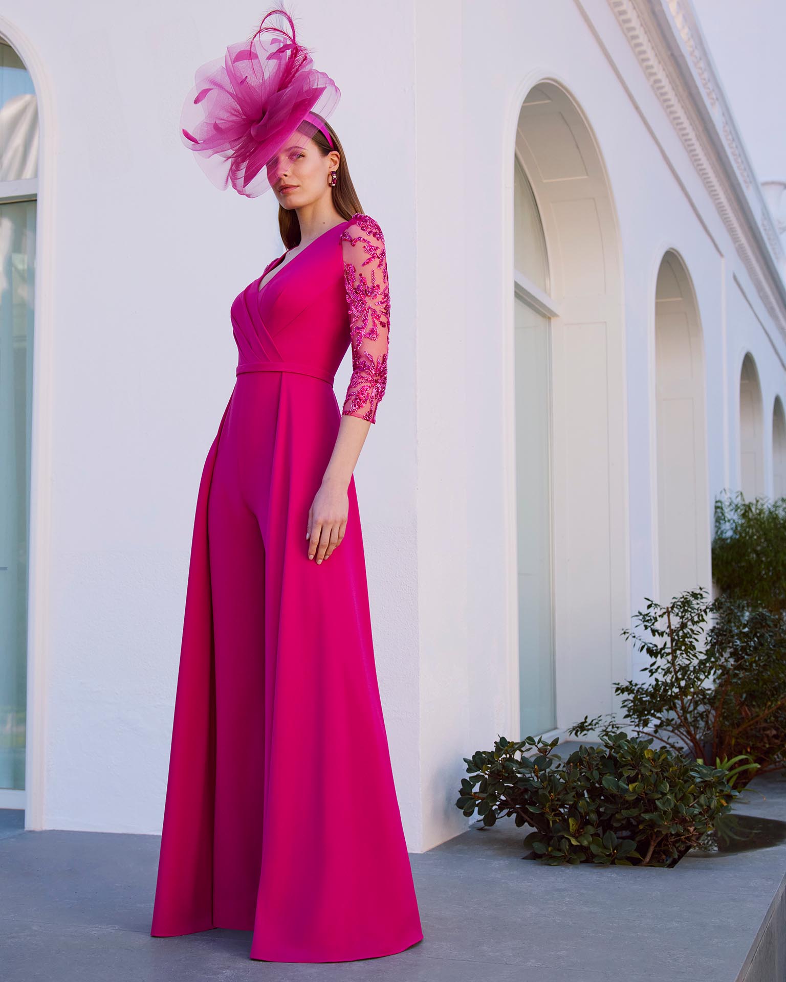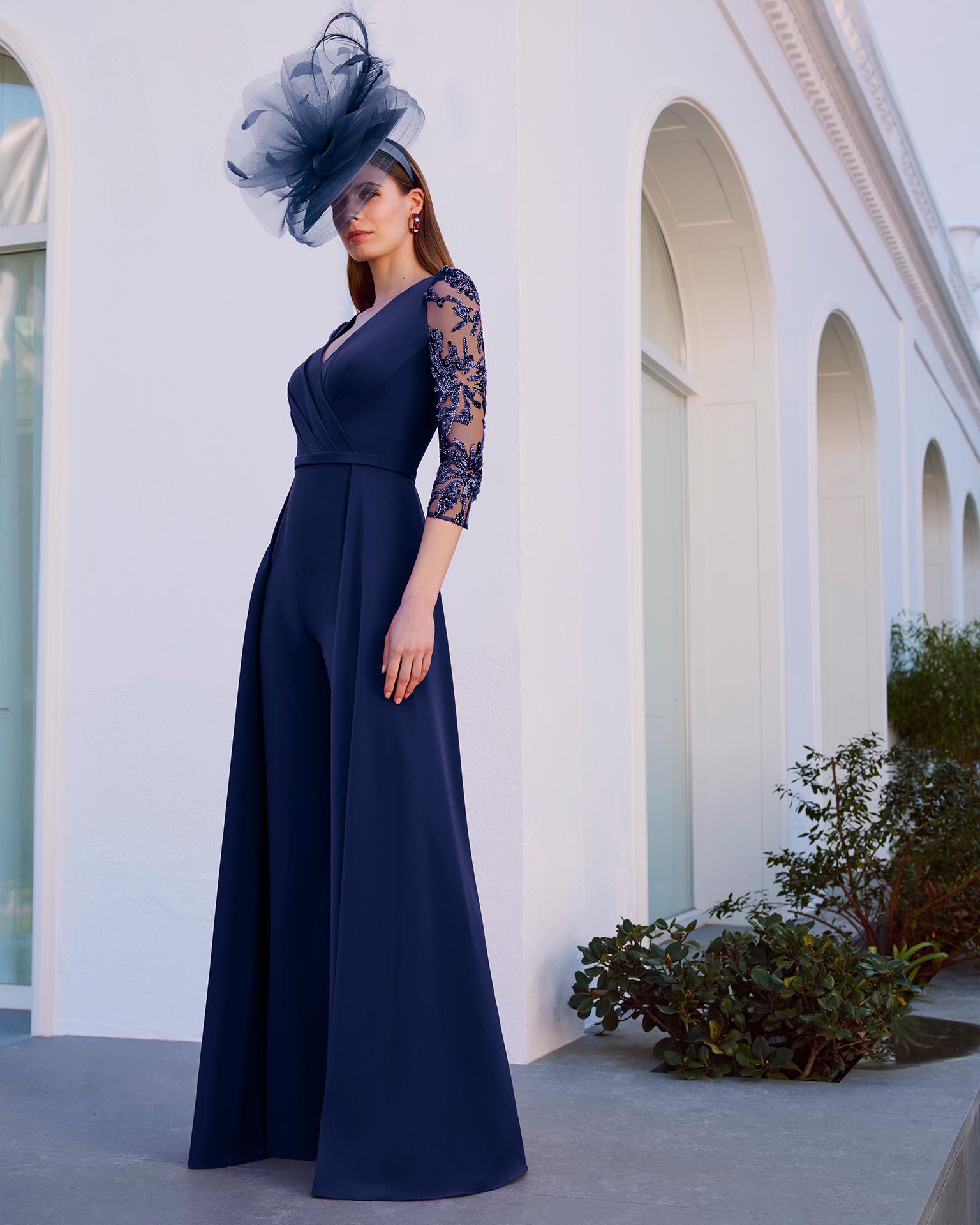 Tuta da sera in crêpe. Scollo a V, maniche a tre quarti e schiena chiusa.