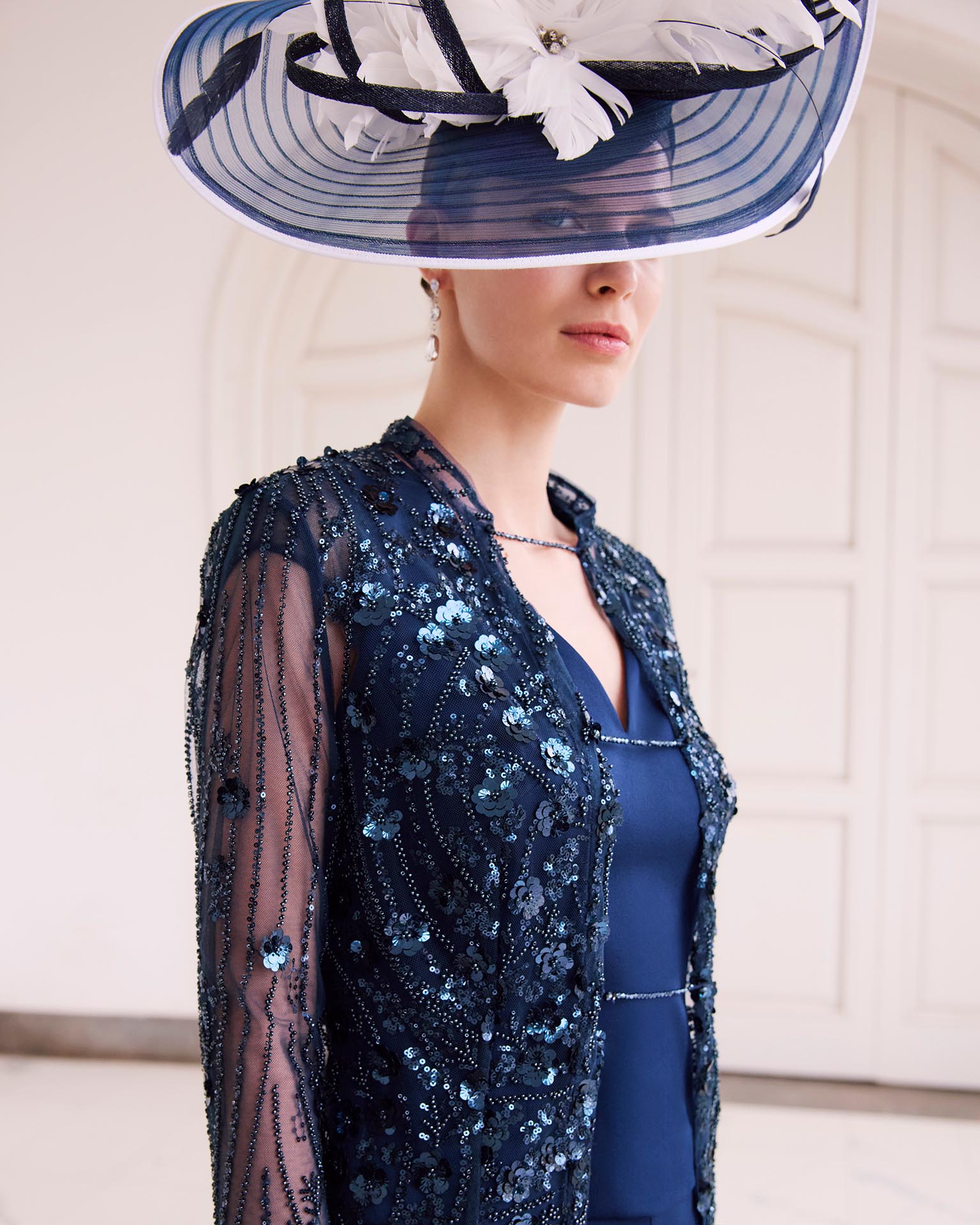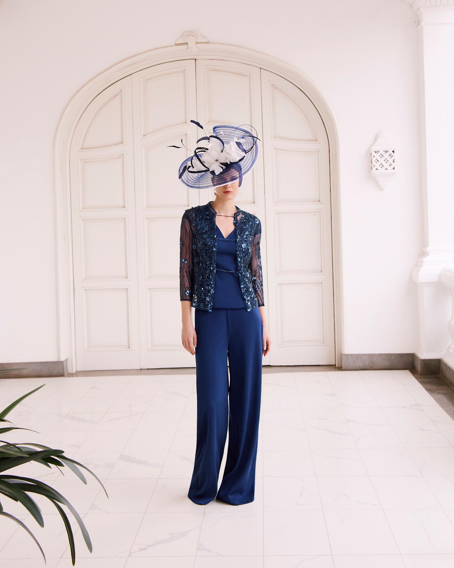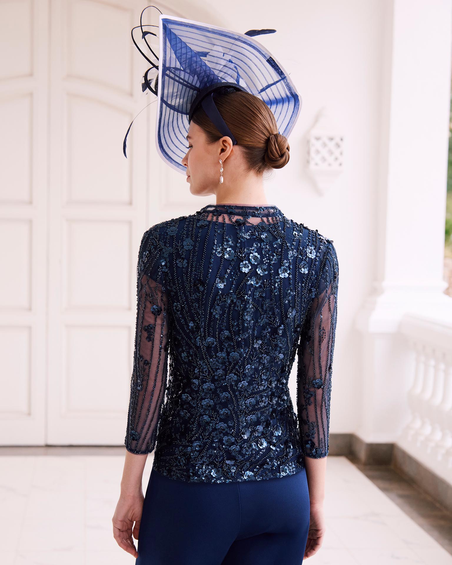 Camicetta e pantaloni da sera, tre pezzi in crêpe satinato. Scollo a V, maniche corte e schiena chiusa. Con giacca.