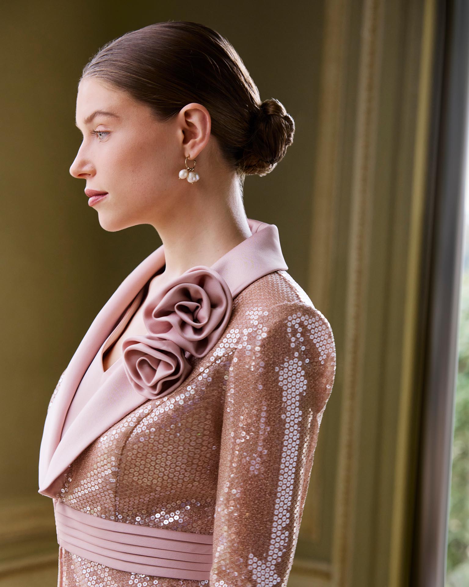 Camicetta e pantaloni da sera, tre pezzi in perline con blusa in crêpe satinato. Scollo a V, maniche corte e schiena chiusa. Con giacca.