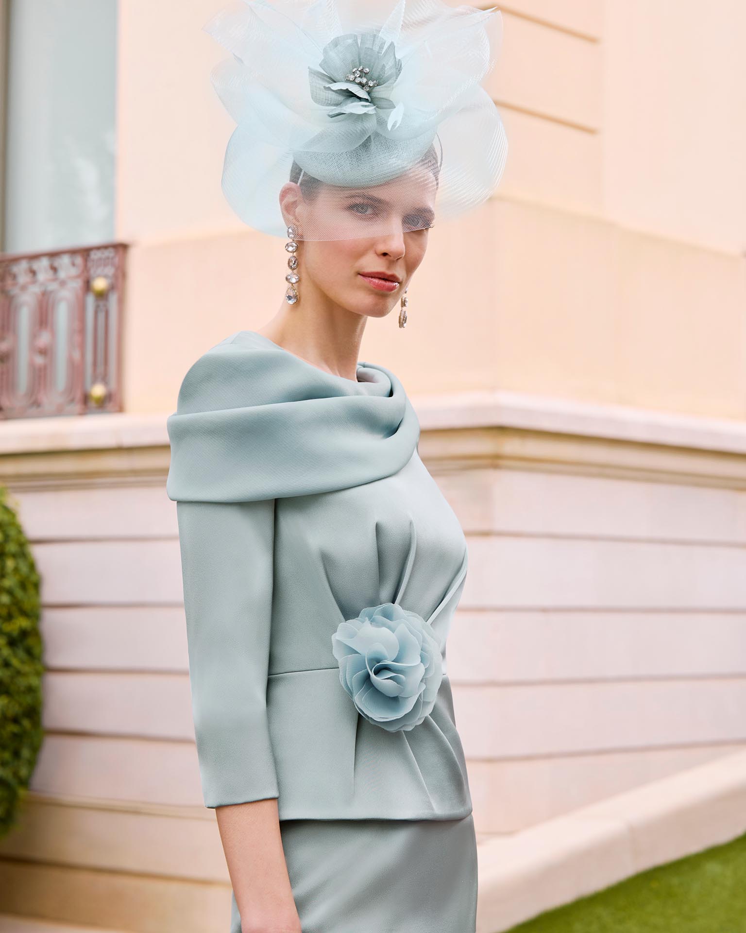 Abito da sera midi, due pezzi in crêpe satinato. Scollo asimmetrico, maniche a tre quarti e schiena chiusa.