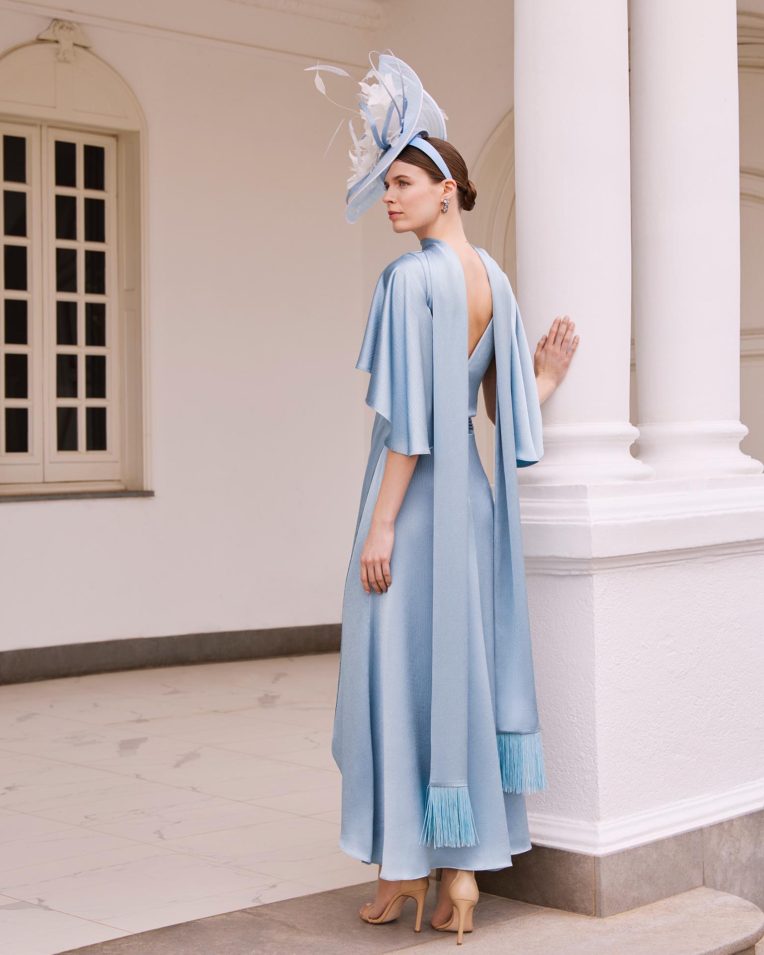Abito da sera lungo, in satin. Scollo a V, maniche a mantella, schiena a V e scialle.
