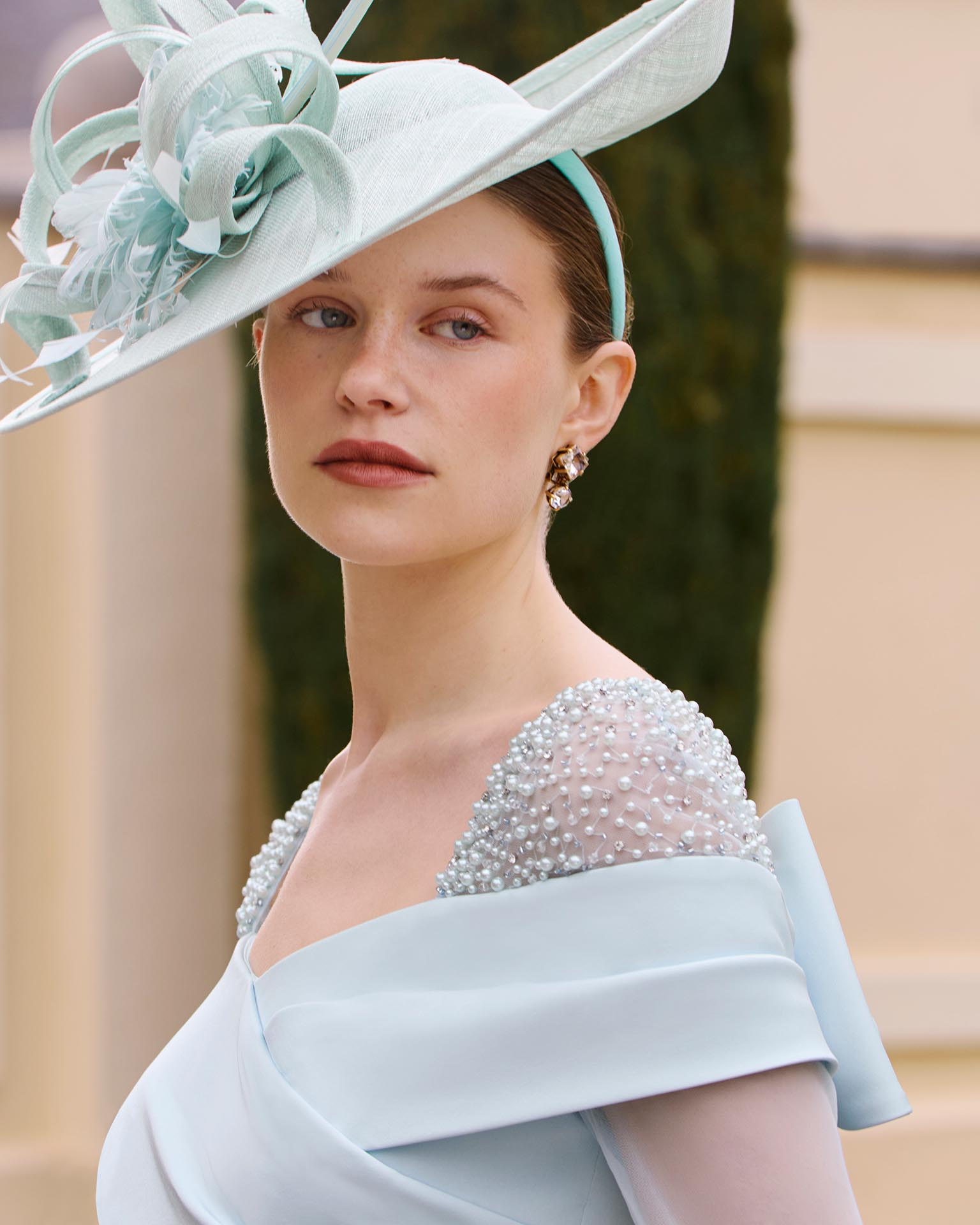 Abito da sera midi, in crêpe satinato. Corpetto decorato con perline, scollo dritto, maniche a tre quarti, schiena con fiocco e scialle.