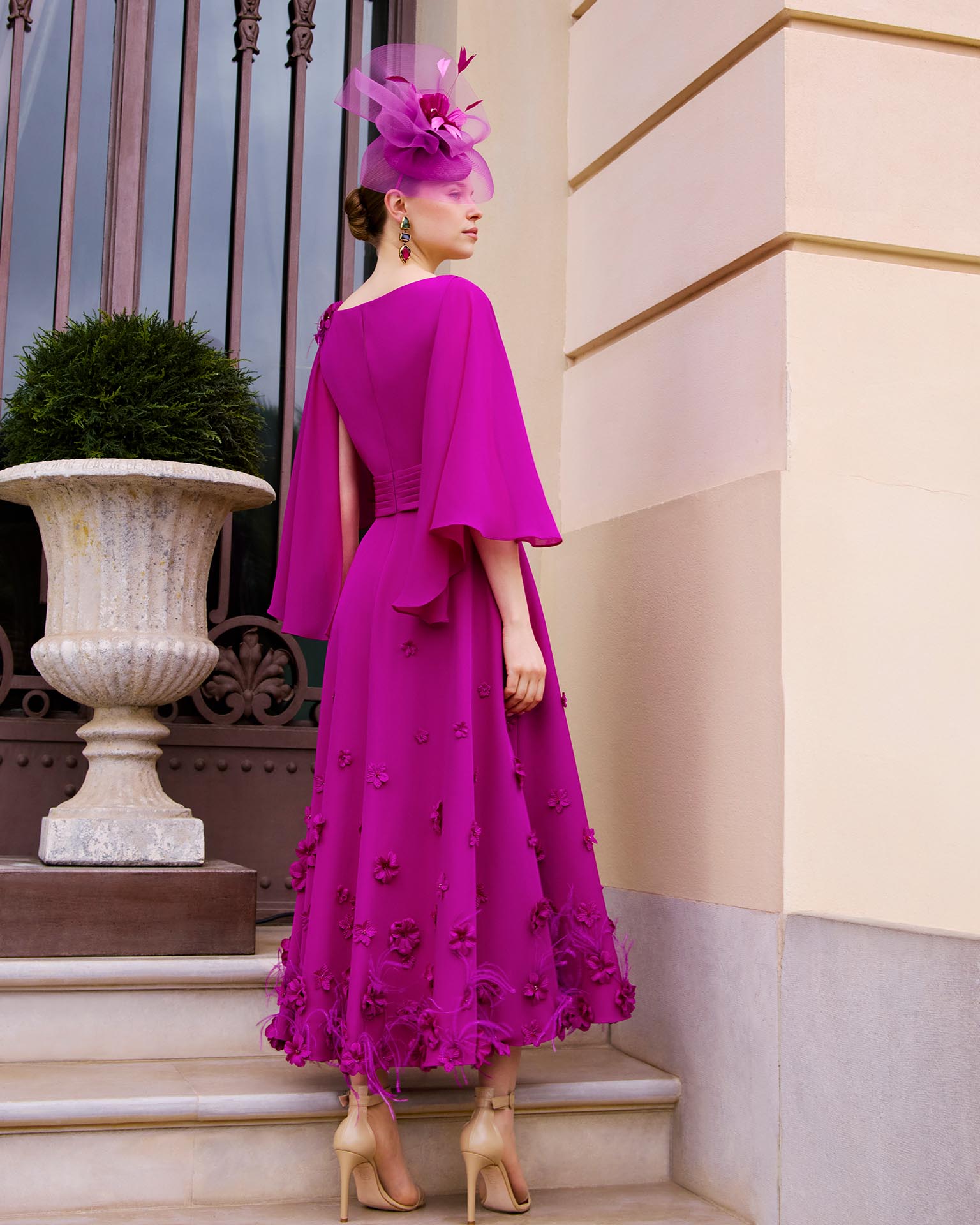 Abito da sera midi, in crêpe. Scollo a cuore, maniche a mantella e schiena aperta.